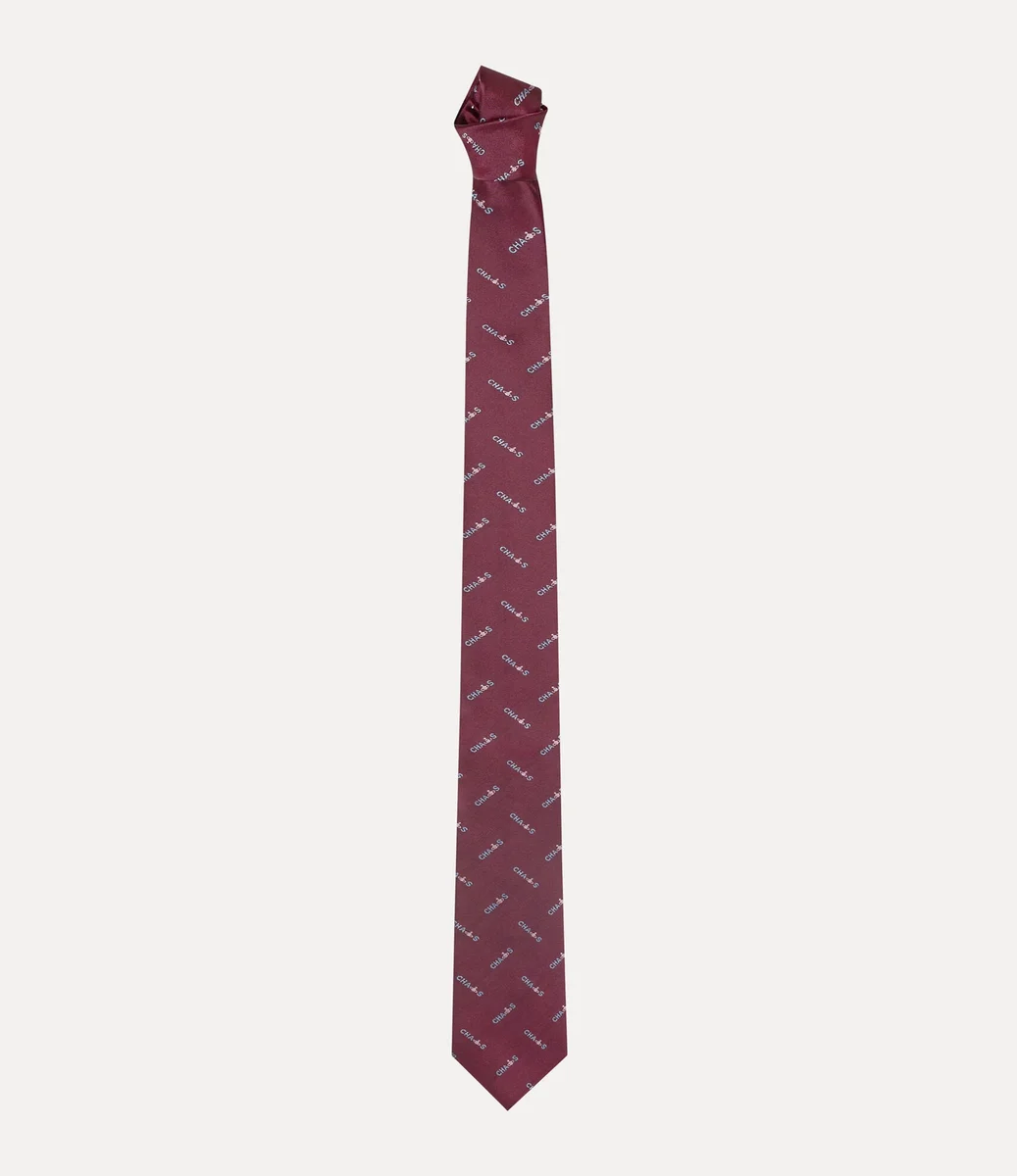 Our silk tie features a wide blade that tapers to a classic pointed tip. The design is finished with the house’s signature “CHAOS” slogan, repeated throughout, capturing Vivienne’s rebellious spirit and her commitment to challenging political conventions.