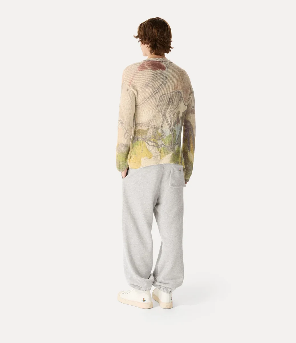 Our Kyle jumper is crafted from soft wool and knitted in an all-over rib stitch. Printed with this season’s ‘Paradise’ artwork by artist Dominic Myatt – depicting a world strewn with trash in an ironic vision of utopia – the design is adorned with the ‘Horses with Orb’ motif at the left-hand side of the chest, finished in a red and blue ombré effect.