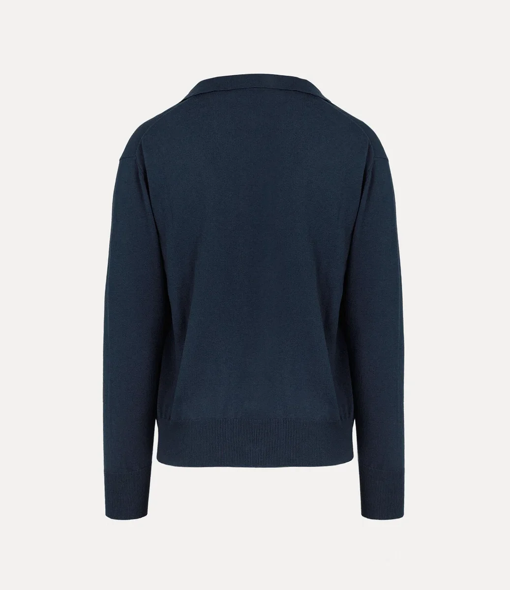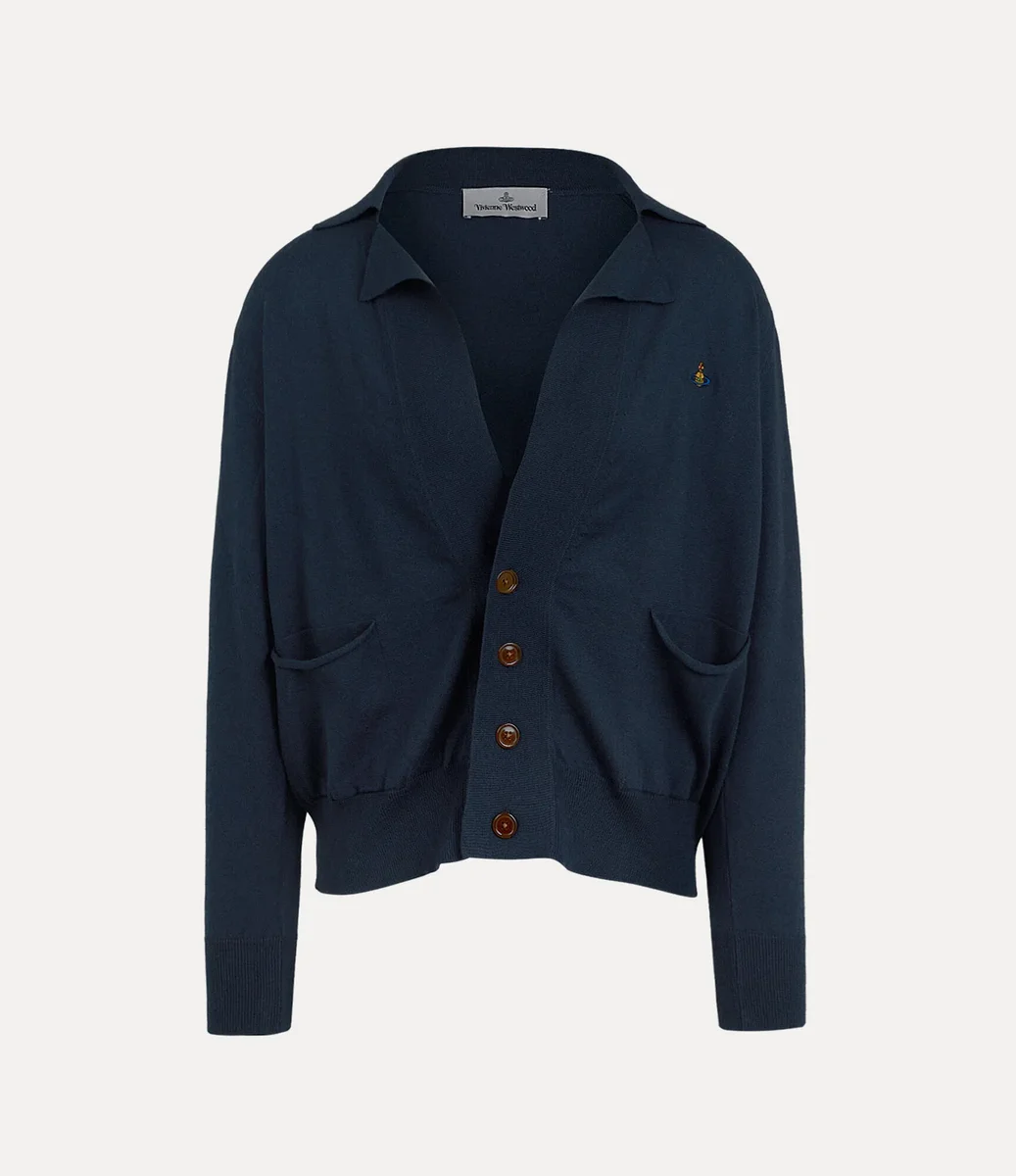 Our Samuel cardigan features a flat open collar and a V-neckline, accented by a row of amber-hued buttons down the front. Finished with an embroidered orb on the left-hand side of the chest, the piece embodies Vivienne’s vision of launching tradition into the future.