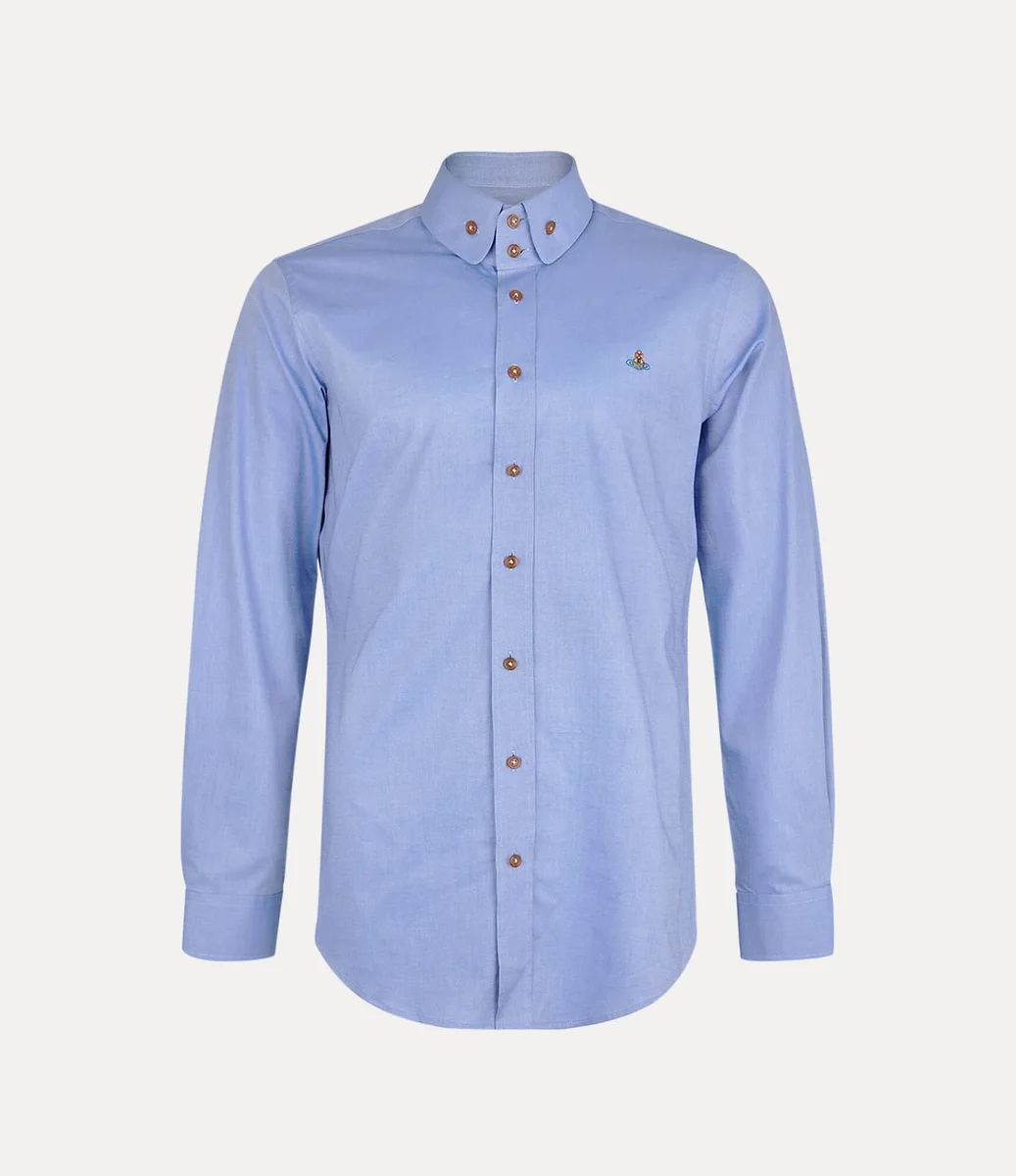 The Two Button Krall shirt is characterised by Vivienne’s two-button neckline and rounded collar, complete with a gently rounded hemline. The long-sleeve design features an embroidered orb, which symbolises tradition, encircled by the celestial rings of Saturn, symbolising the future.