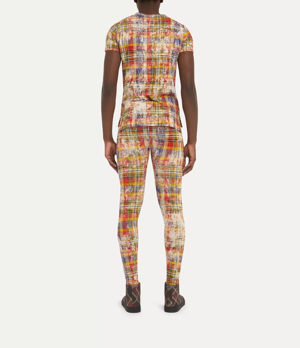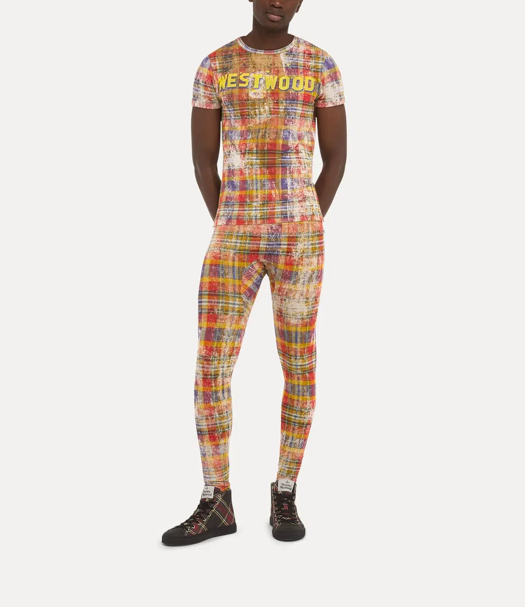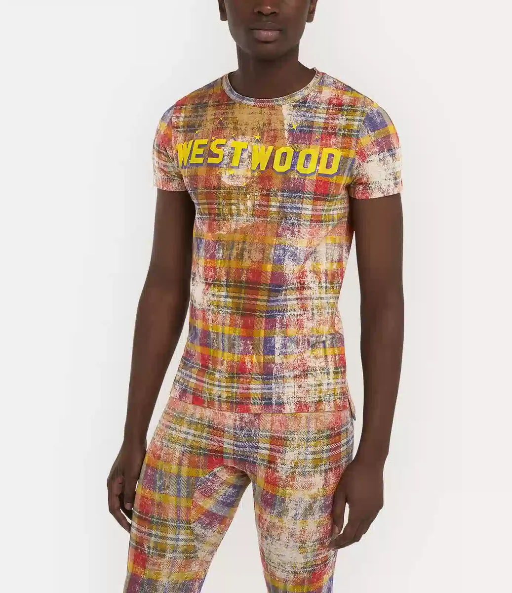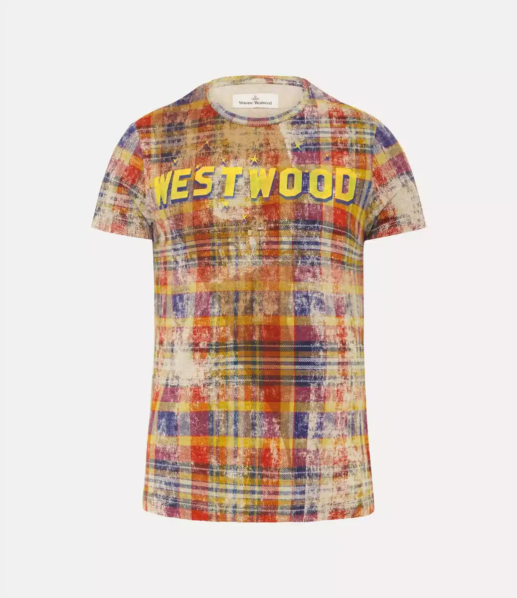 Our Peru T-shirt features a distressed tartan motif throughout the design, inspired by traditional Scottish Highland regalia. The chest is printed with ‘Westwood’ in large yellow block letters with a blue shadow, drawing inspiration from the iconic Hollywood sign.
