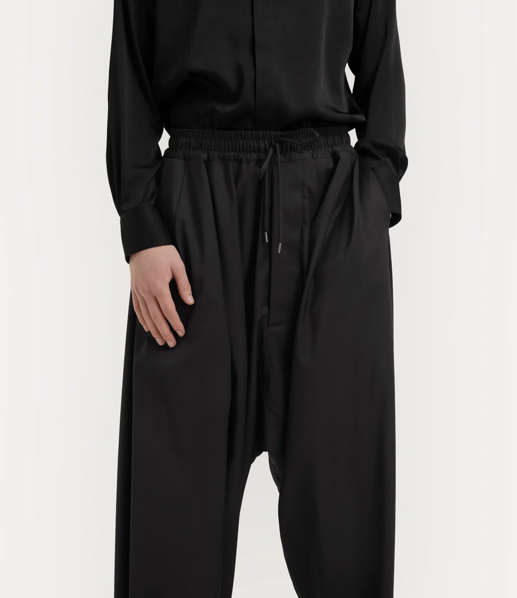 Our Balloon trousers have been reimagined this season in a soft wool finish, cut to a high-rise waist with a fluid drawstring closure. A dropped crotch detail flows into a voluminous wide-leg silhouette, while two flap pockets adorn the back.
