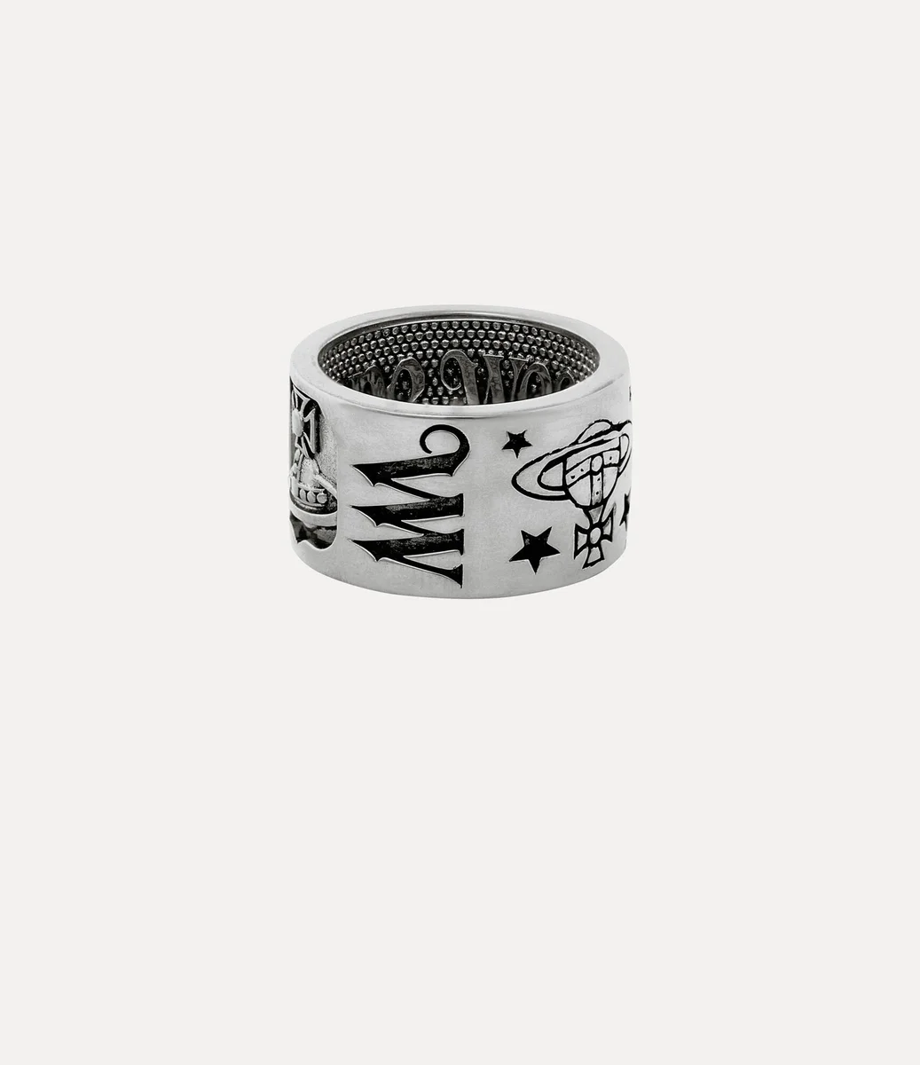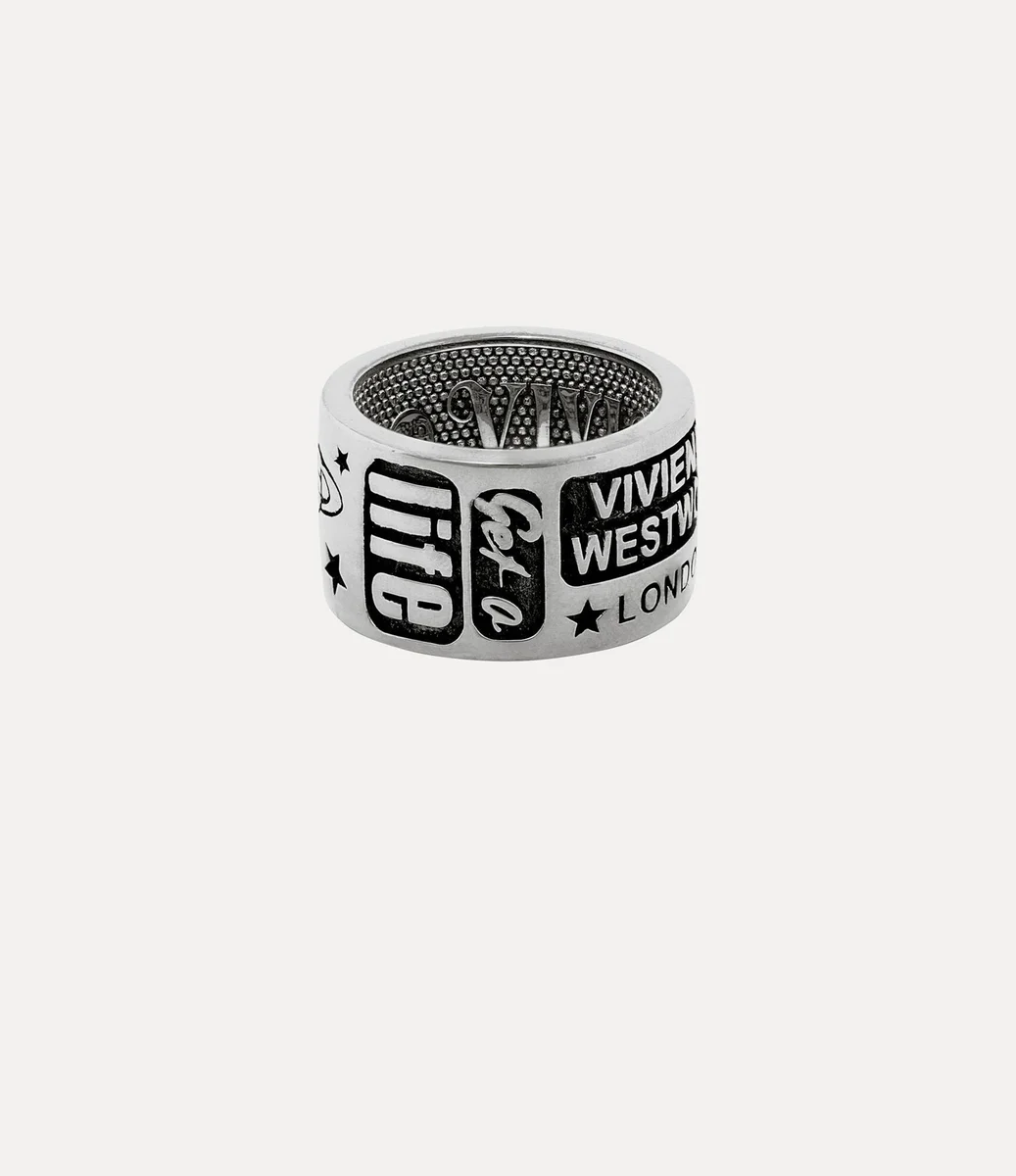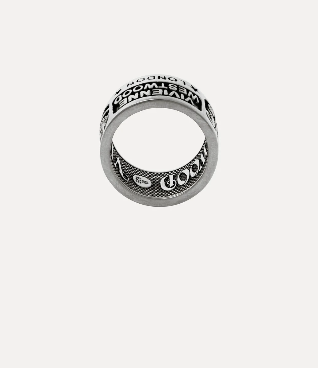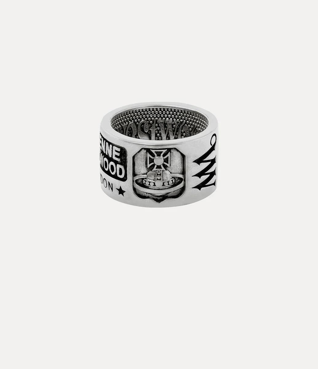 Vivienne Westwood Lancelot ring, crafted from platinum-tone plated recycled silver, is inscribed with signature phrases and motifs inspired by the house’s history.