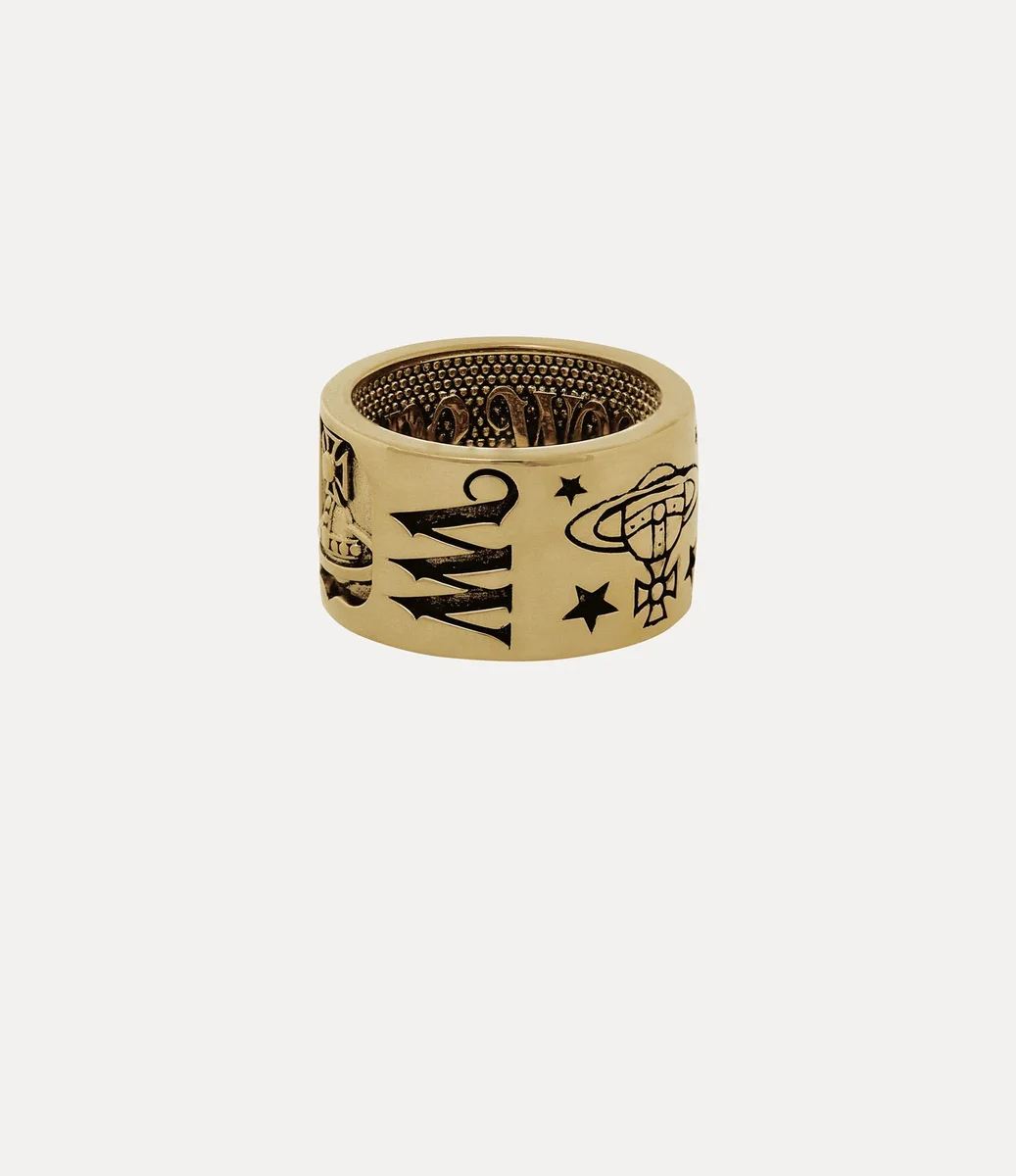 Vivienne Westwood Lancelot ring, crafted from gold-tone plated recycled silver, is inscribed with signature phrases and motifs inspired by the house’s history.