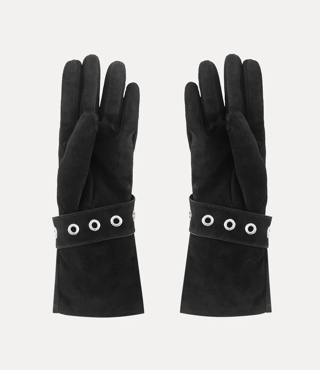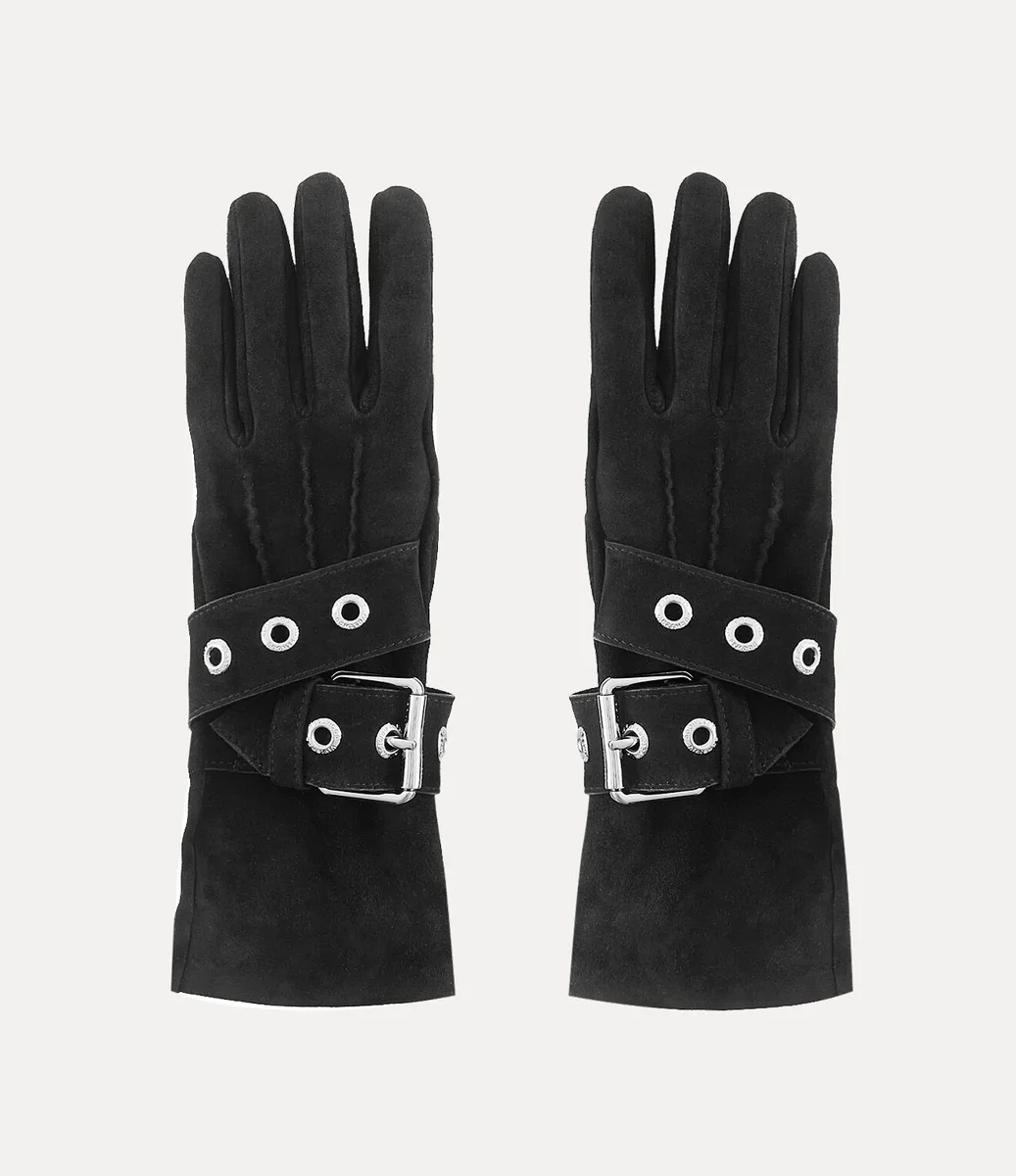 Vivienne Westwood Belt buckle gloves are offered in soft, suede leather, complete with an extended cuff length.