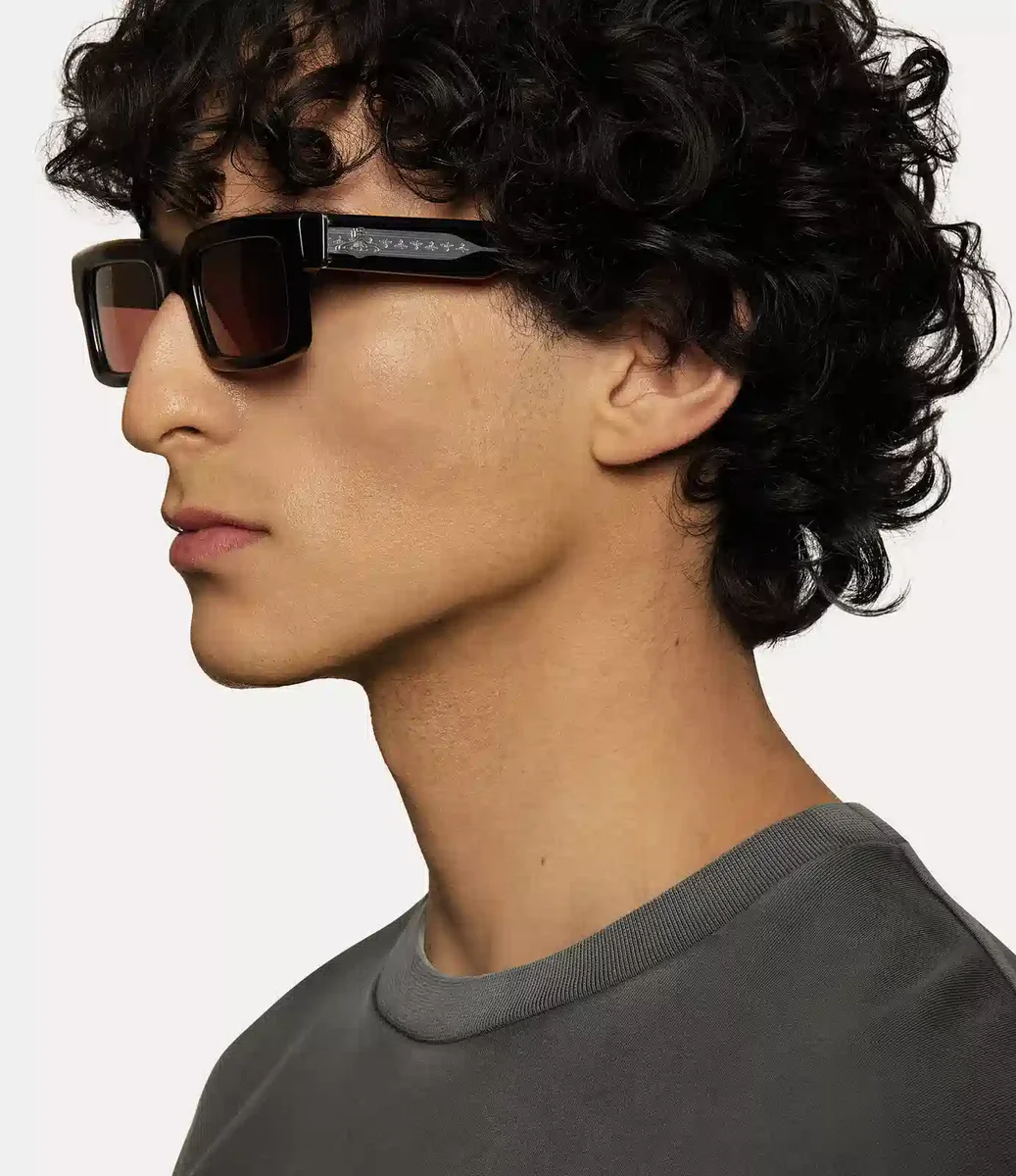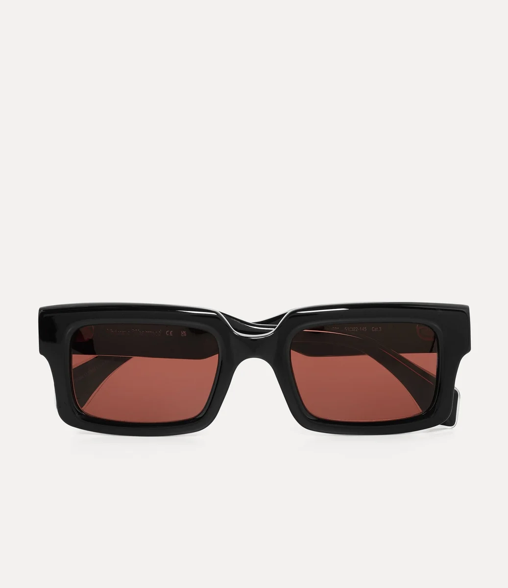 The silhouette of the shiny black Costello sunglasses takes inspiration from iconic cultural figures of stage and screen. Featuring chunky square frames with brown tinted lenses, the statement design is elevated by intricate horn accents adorning the outer rim – recalling Vivienne’s iconic Horn Alice band. The sculpted arms are embellished with orb motifs at the temples, while bespoke metal details are finished with miniature orb engravings.