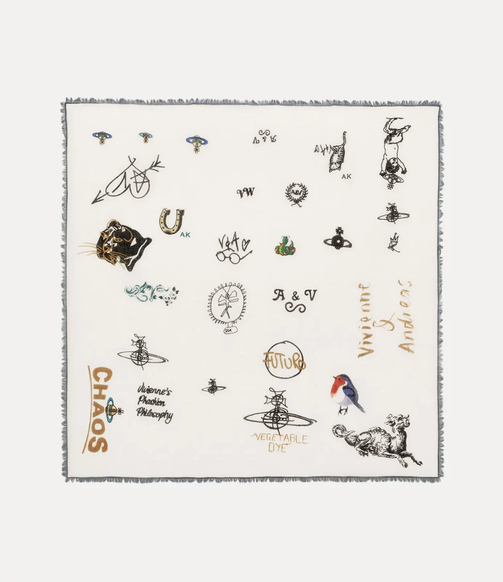 Vivienne Westwood Logos square features the ‘Patches’ artwork, celebrating iconic house symbols. The design is finished with varied signature orb motifs.