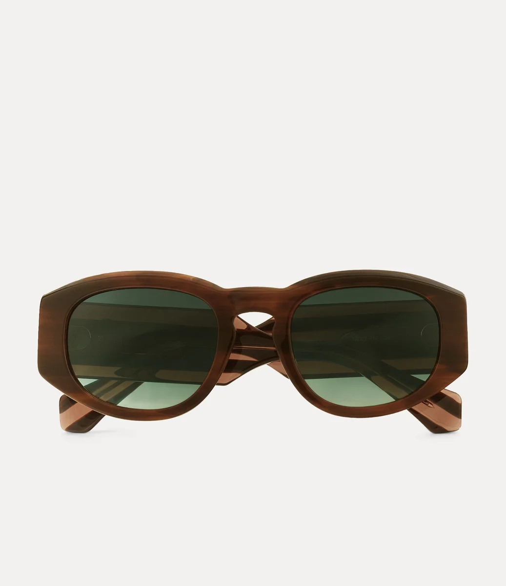 The Reed sunglasses feature vintage-inspired oval frames with smooth horn-effect trims, influenced by 1950s–60s photography and 1980s underground icons. Fitted with gradient UV-protective lenses, the piece is finished with a two-dimensional metal orb at the temples, reflecting Vivienne’s vision of taking the past into the future.