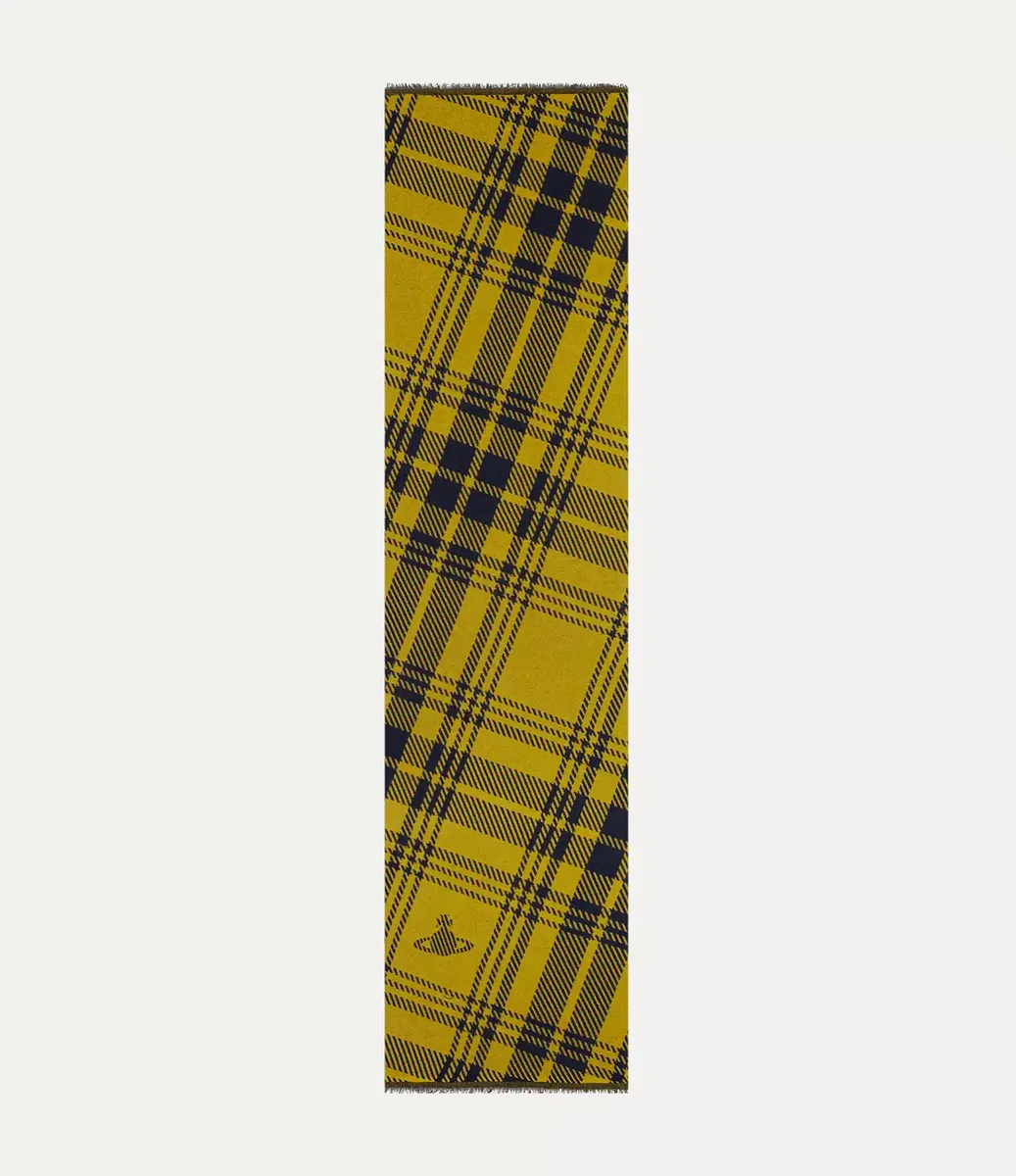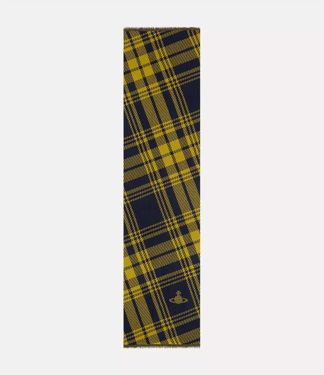 Vivienne Westwood scarf is crafted from soft wool and woven with a tartan motif, inspired by traditional Scottish Highland regalia.