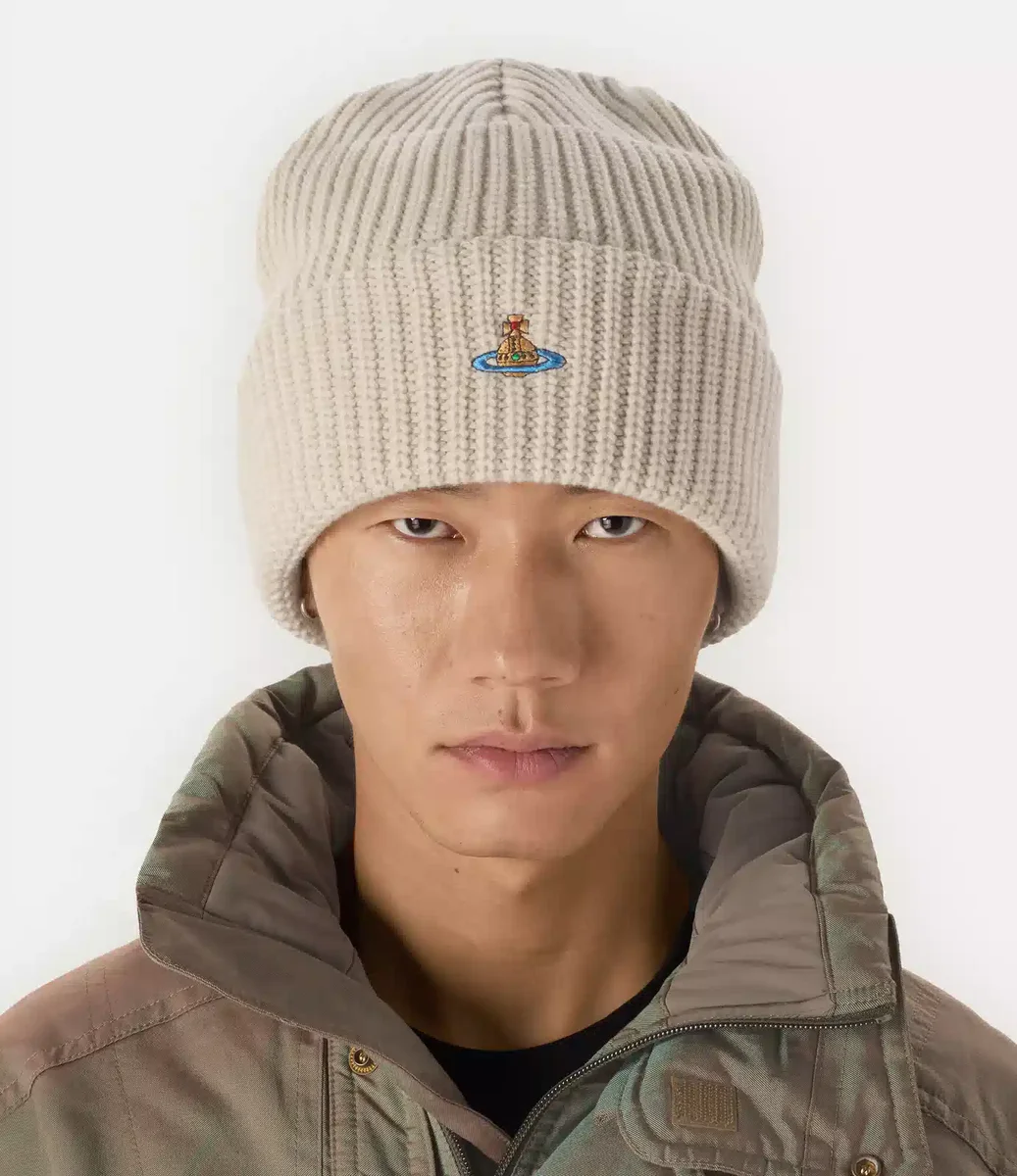 Vivienne Westwood Sporty beanie receives a ribbed texture and a chunky knit design, finished with a wide folded brim and multi-coloured orb embroidery.