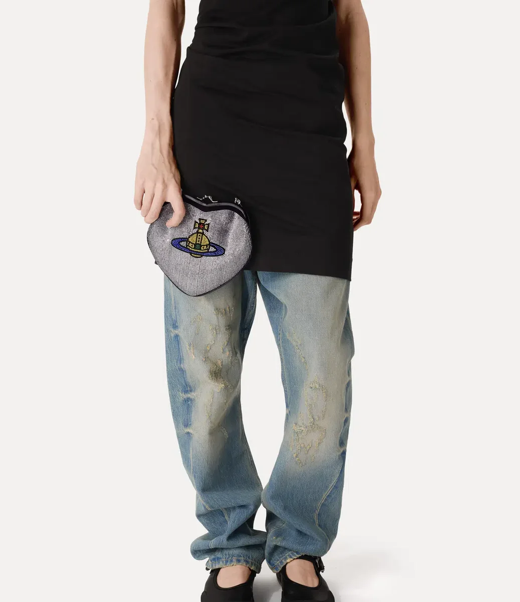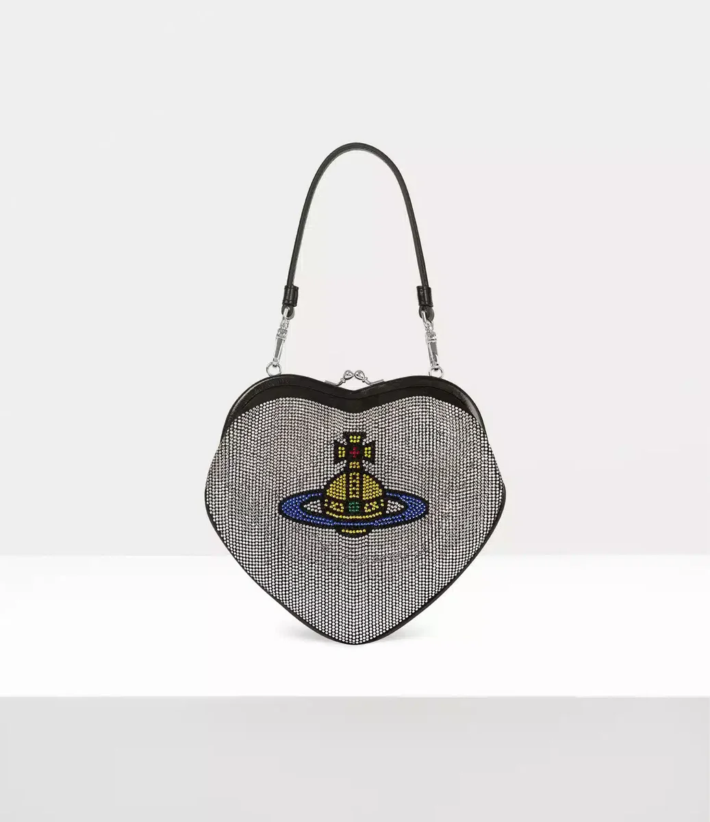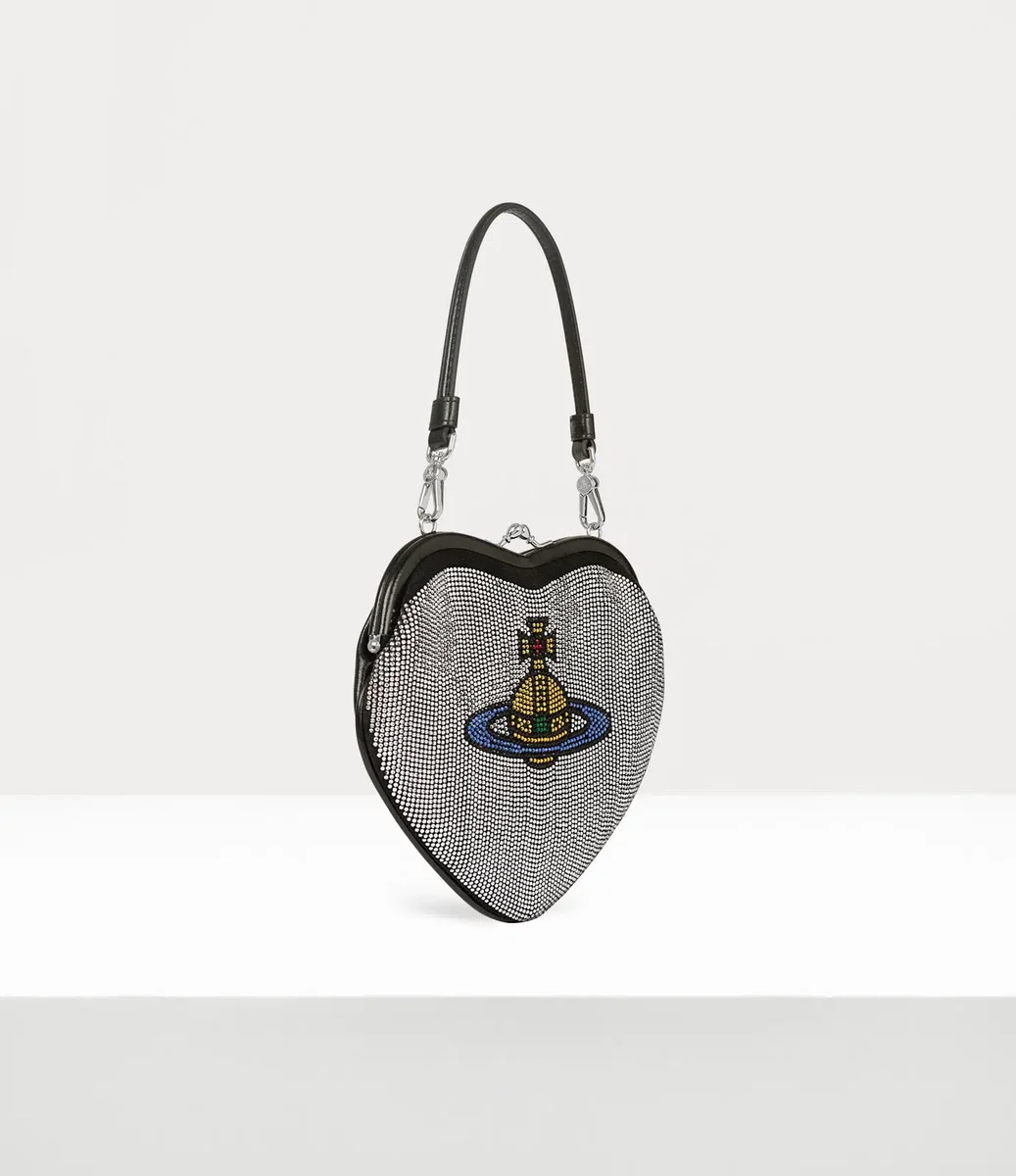 Vivienne Westwood Belle Heart Frame purse features a heart-shaped silhouette, which is embellished with rows of shimmering diamanté gemstones.