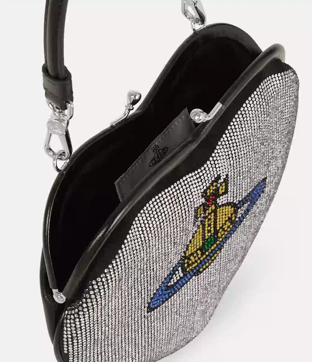 The Belle Heart Frame purse features a heart-shaped silhouette, a nod to Vivienne’s affection for humanity and the planet, complete with polished leather trims and our signature silver-tone hardware. Embellished with rows of shimmering diamanté gemstones, the design captures the opulence of grand hotel interiors.