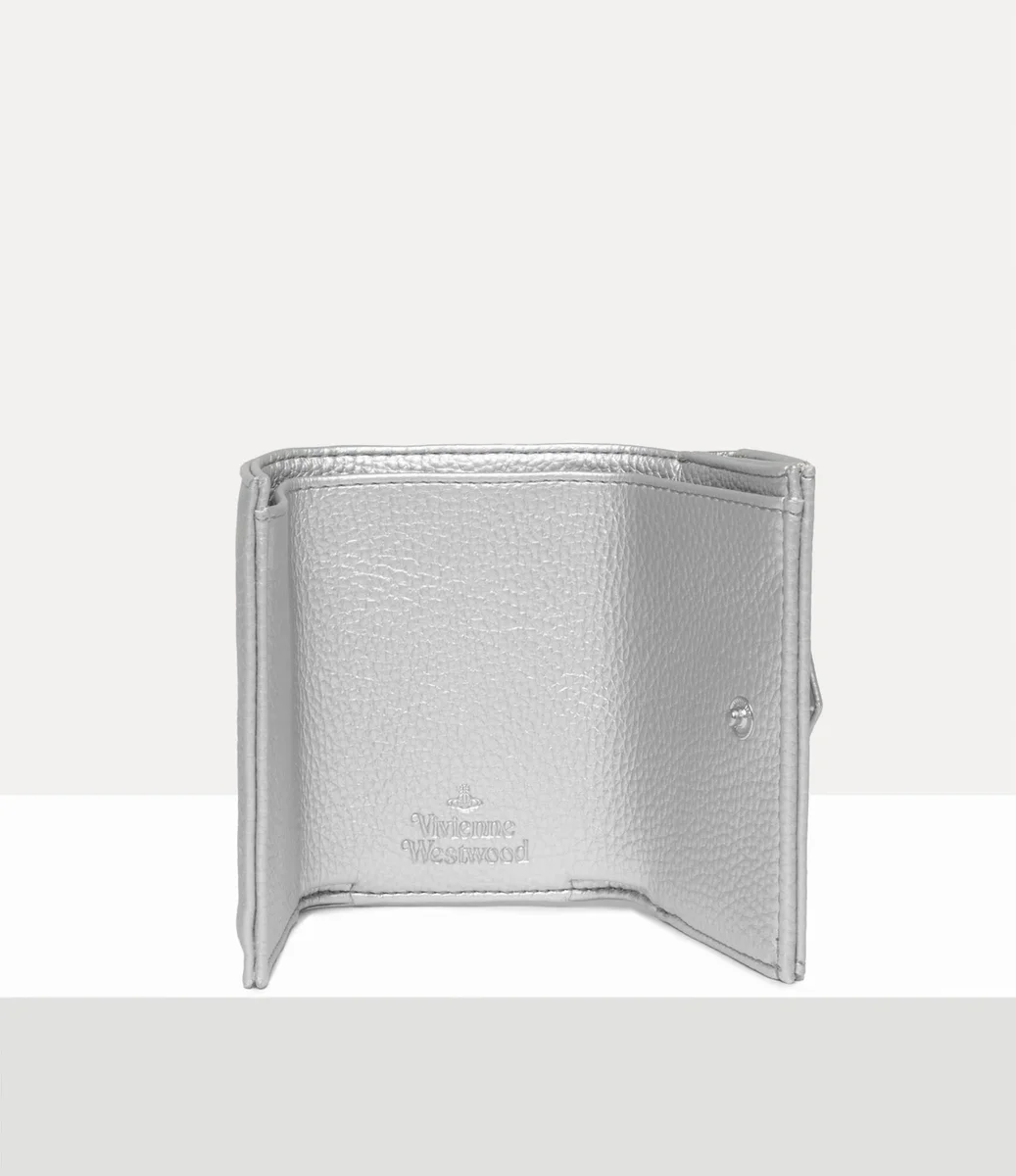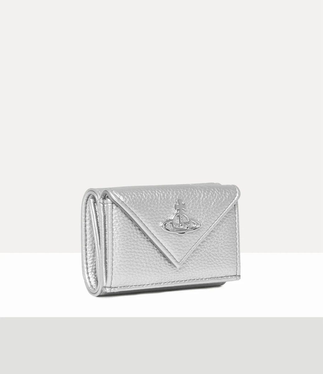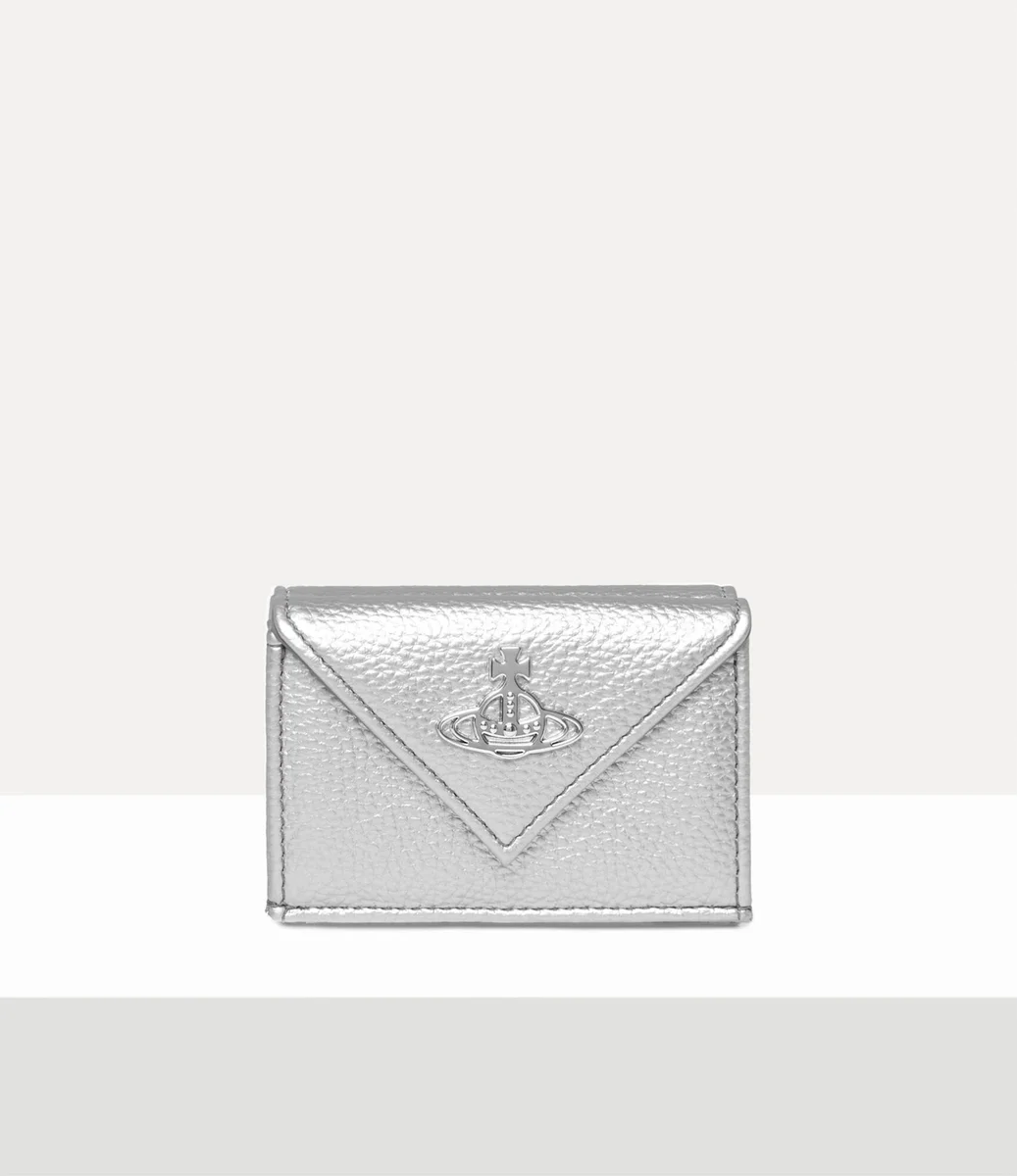 Our Envelope billfold features a silver PU silhouette, embossed in this season’s grained-effect finish. The design offers the house’s signature metal ‘Line Orb’ motif on the press-stud fastening, embodying Vivienne’s vision of propelling tradition into the future.
