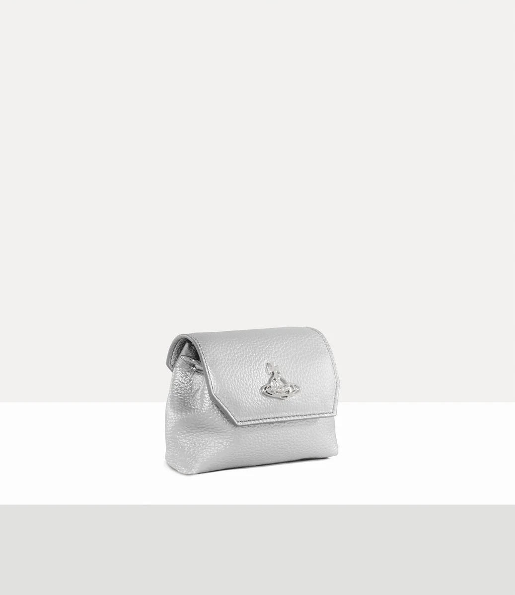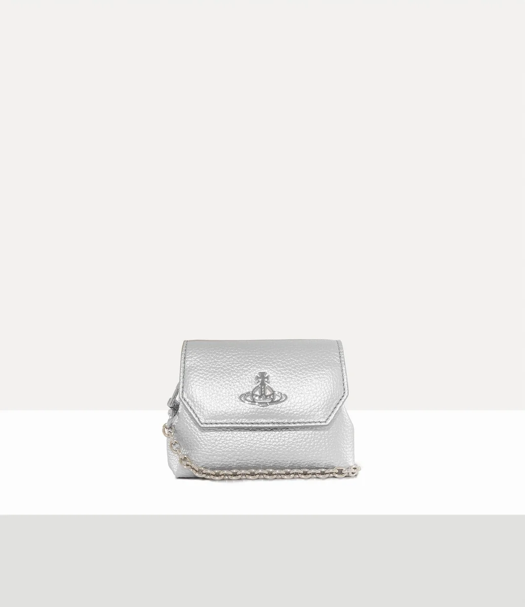 Vivienne Westwood Nano pouch features grain-effect embossing across the design, adorned with silver-toned hardware and a removable chain strap.