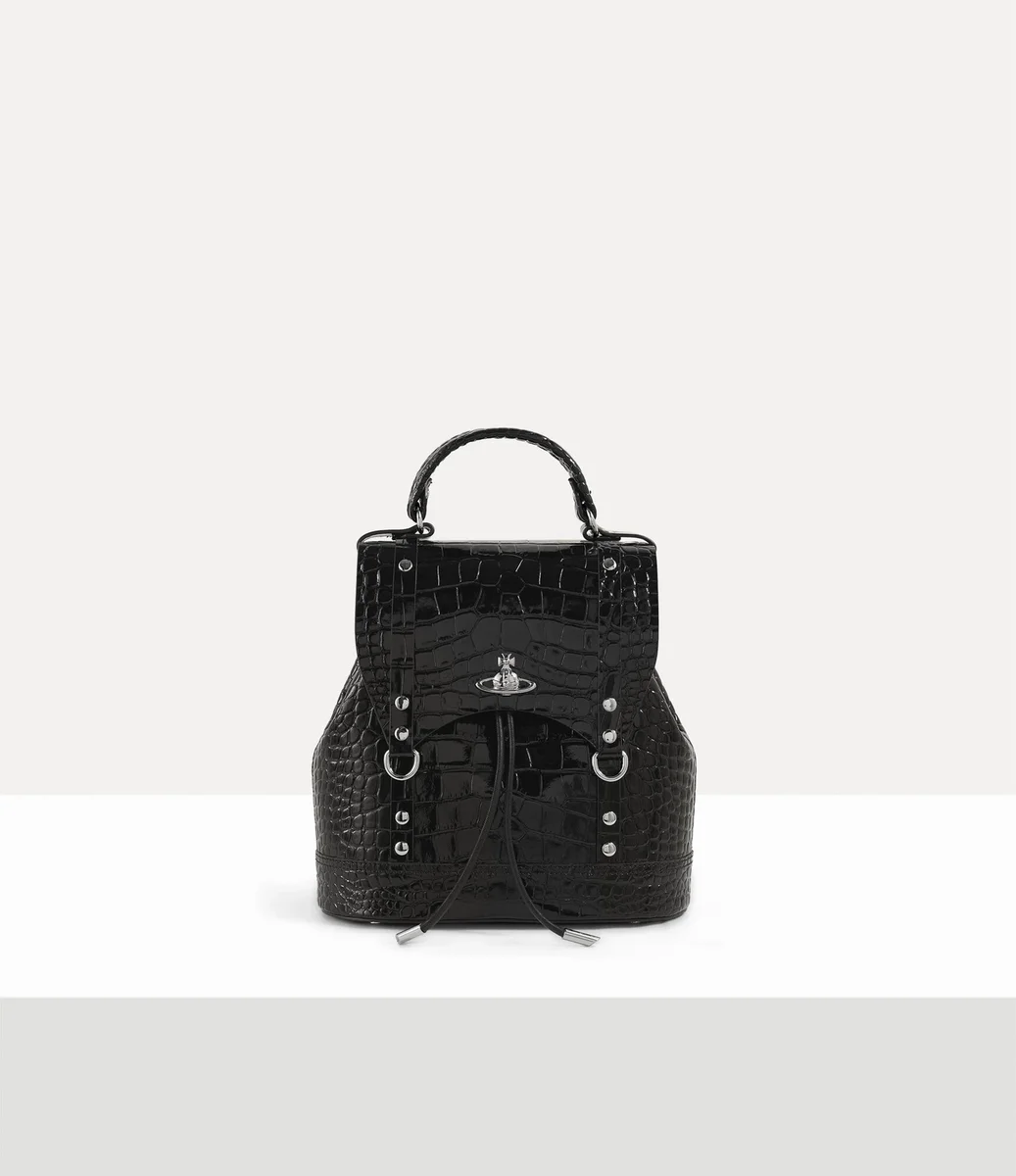 Vivienne Westwood Max Small backpack is offered in a croc-effect embossed leather finish, complete with a patent texture.