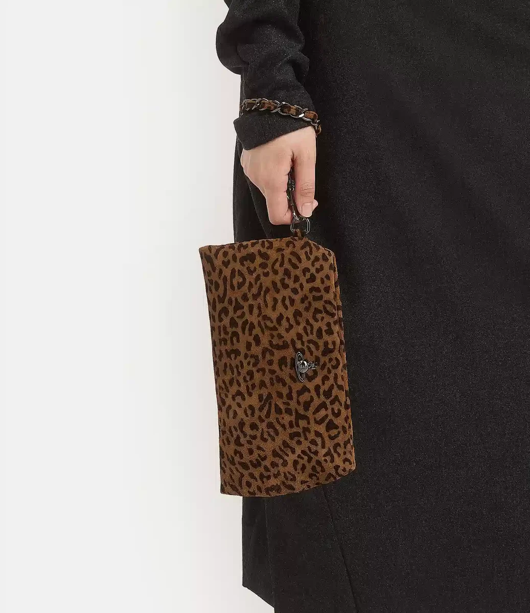 Vivienne Westwood Sadie wristlet pouch is crafted from leopard-print suede and complete with a lightly padded, rectangular shape.