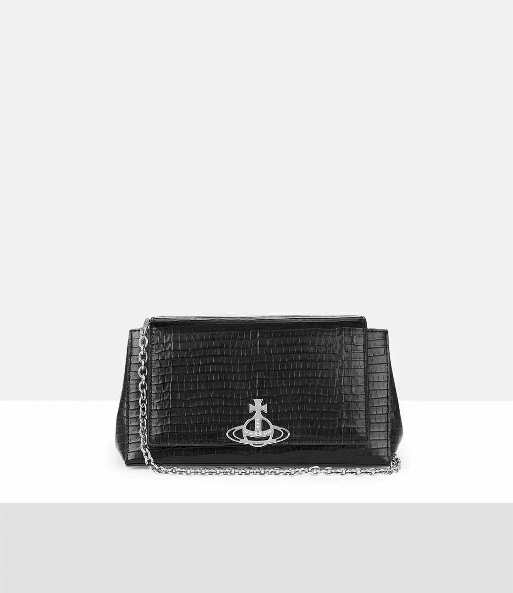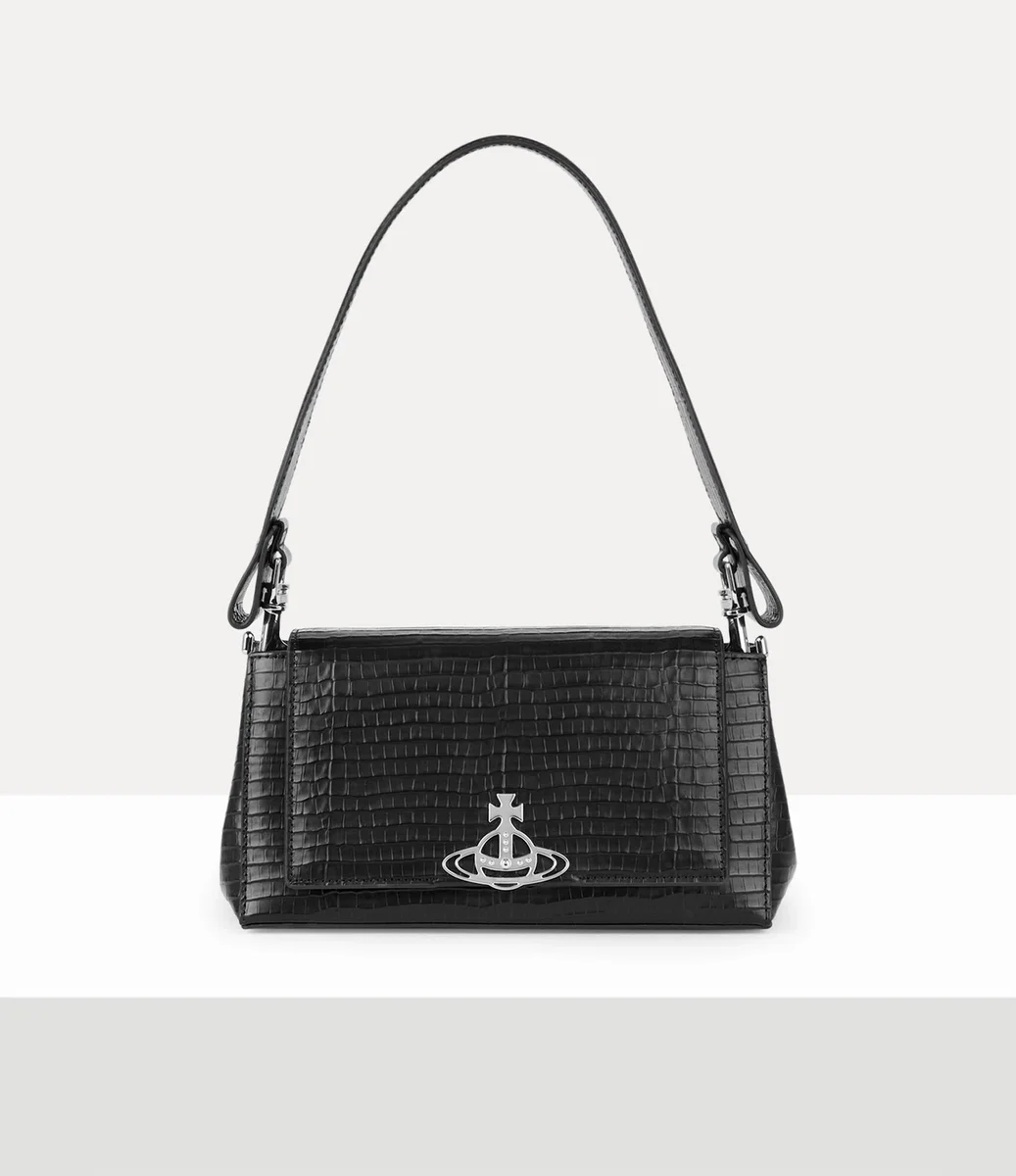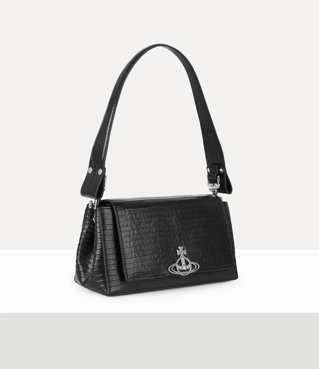 Vivienne Westwood Hazel Medium handbag is crafted leather, complete with a ‘Mini’ croc-effect embossed finish this season.