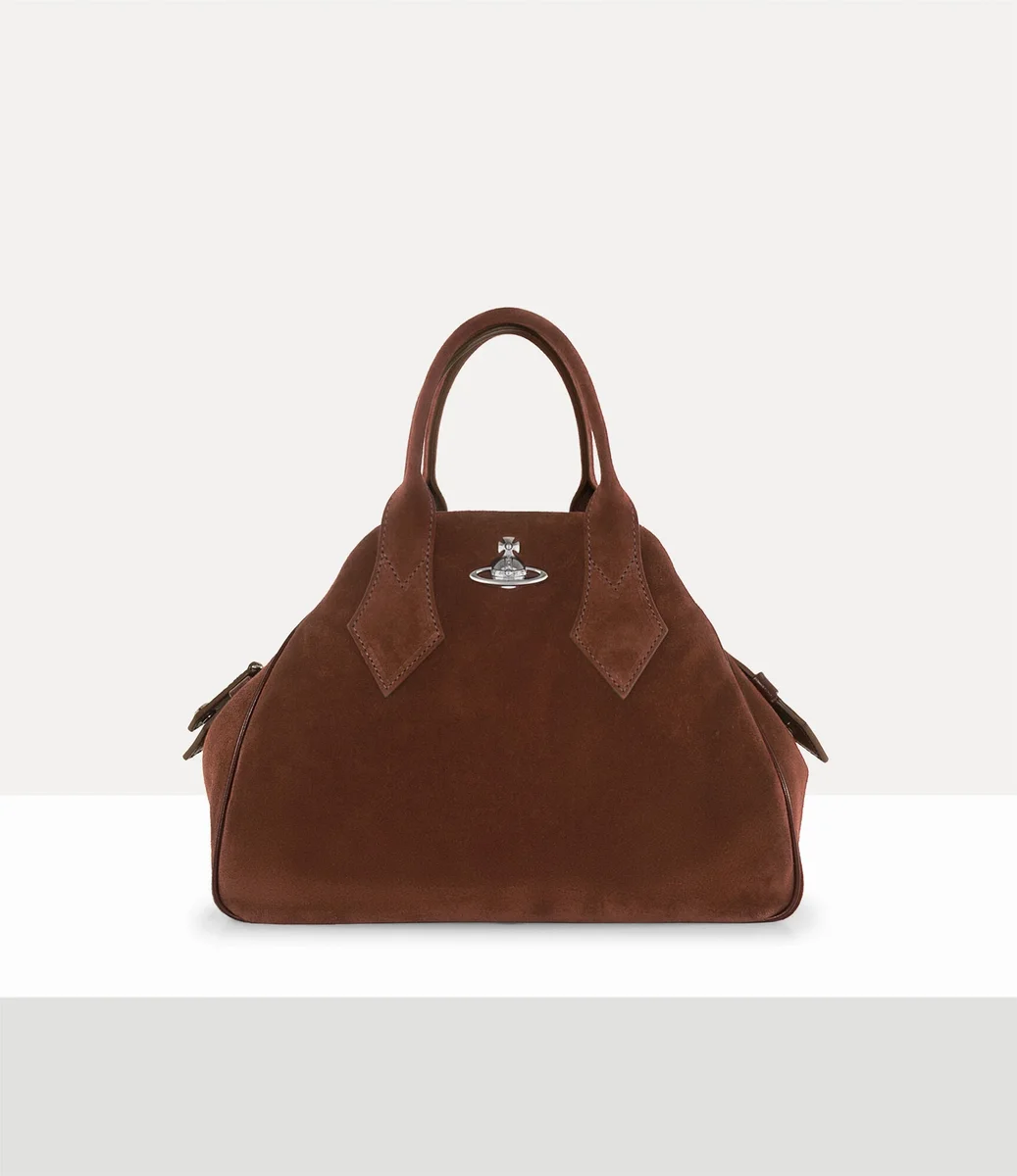 Our Yasmine Medium bag is reimagined in supple suede leather, complete with a dual top-handle silhouette. The interior is lined with the house’s signature ‘Broken Pinstripe’ motif – a reinterpretation of the classic pinstripe pattern, first introduced in the Vivienne Westwood Gold Label Autumn-Winter 2015 collection.