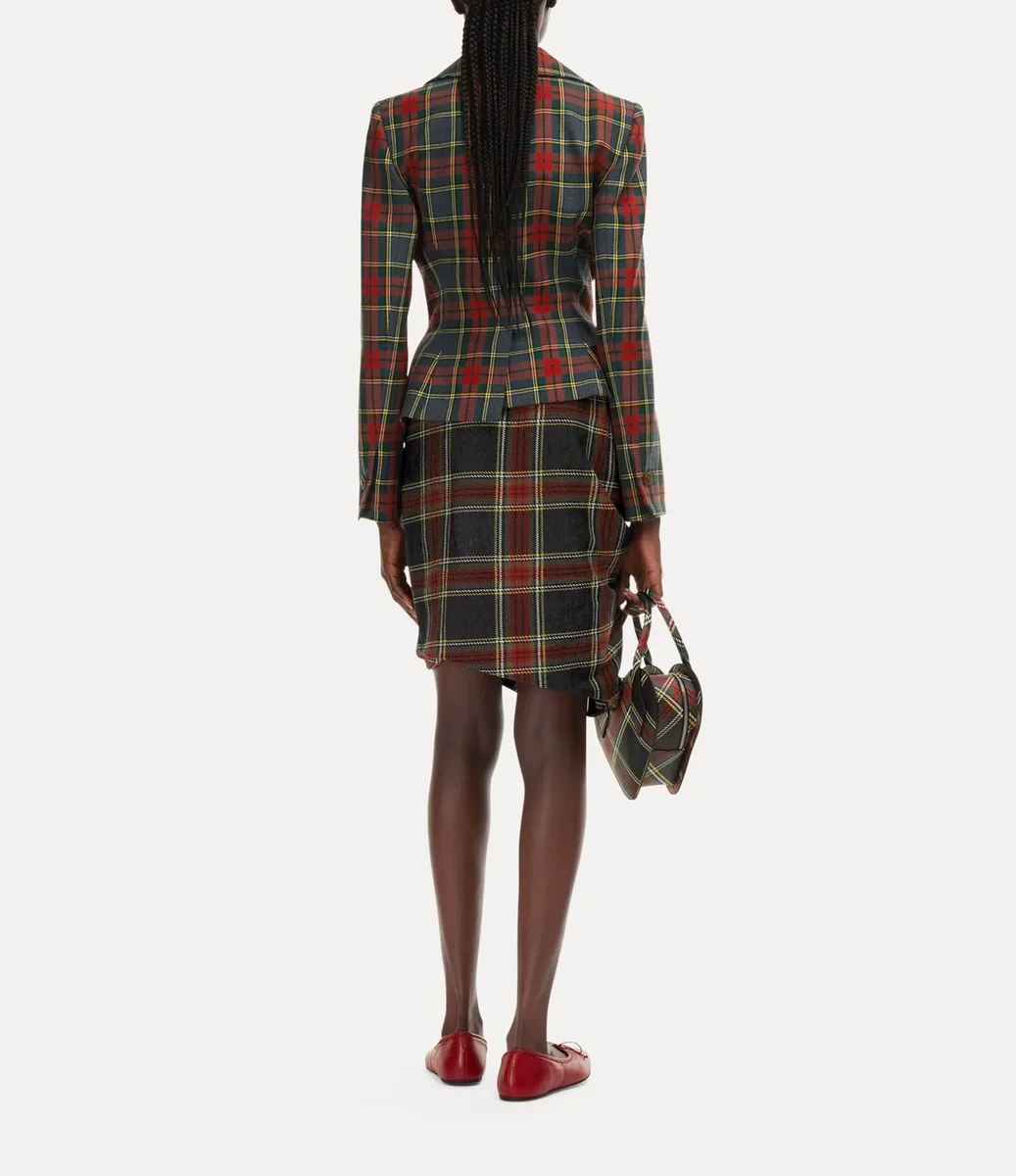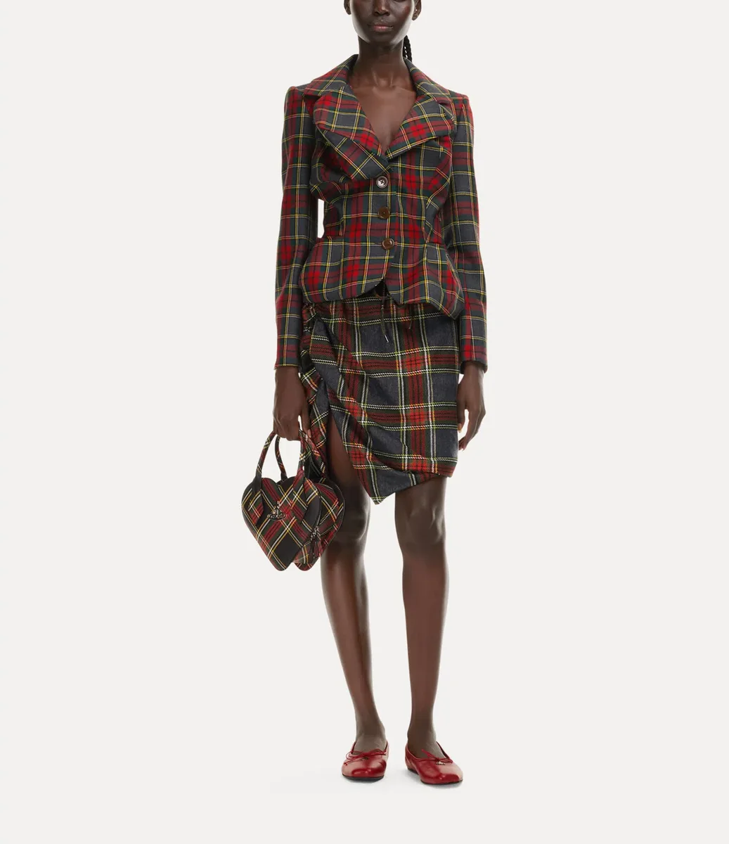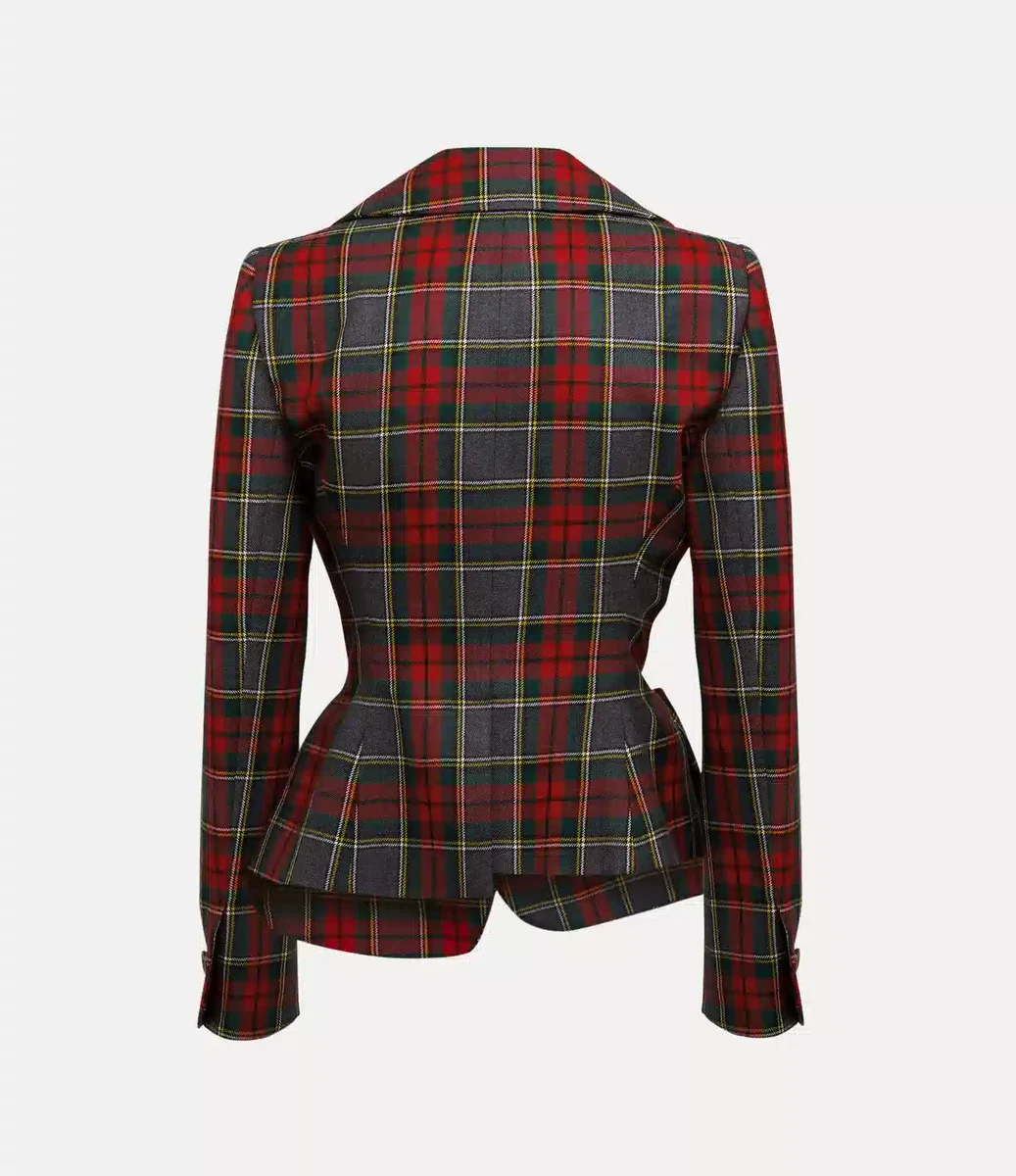 Our Drunken jacket employs Vivienne’s original experimental drunken tailoring pattern cutting system – where garment elements are distorted assuming an almost surreal shape. The piece is offered in the vibrant ‘Scarlet’ tartan this season, finished with a front-button fastening.