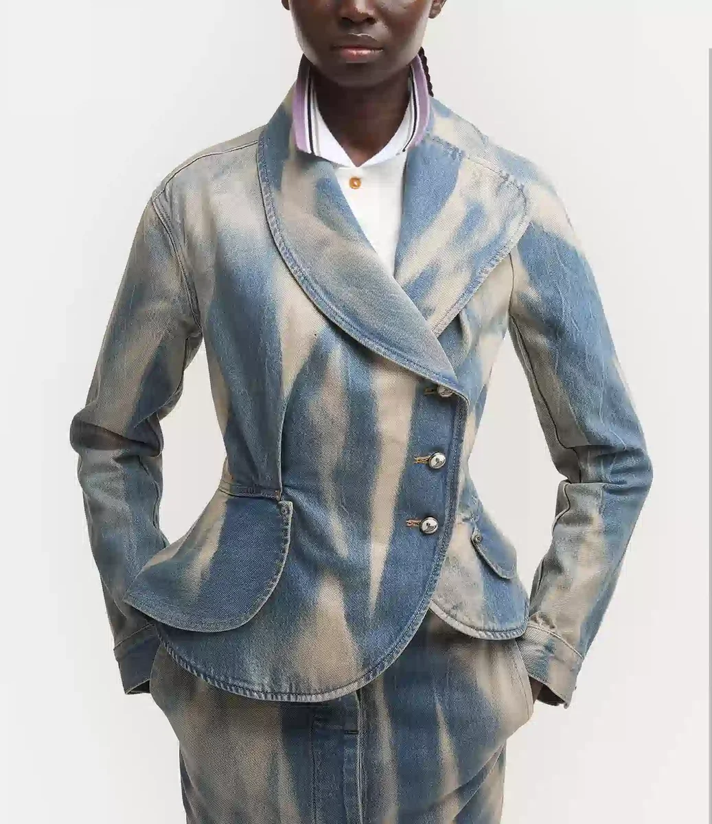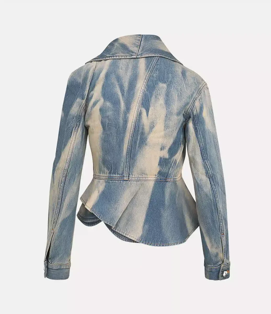 Crafted from soft cotton, our Stormy denim jacket features a bleached, faded wash that lends a distressed, vintage-inspired finish. The design is defined by its exaggerated asymmetric lapel, which brings a sculptural edge to the neckline, while the sharply contoured waist and flared hem create a defined, tailored silhouette.