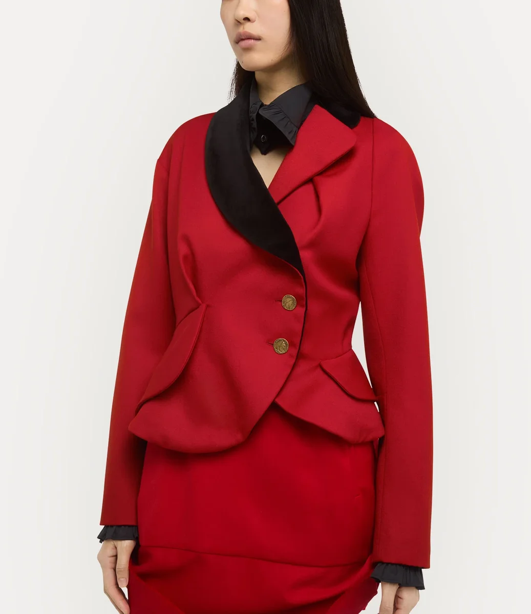 Crafted from soft wool, our Stormy jacket features a contrasting black shawl collar and an asymmetric front closure with two gold-tone embossed buttons. Delicate darting shapes the waist, flowing into a sculpted peplum hem.