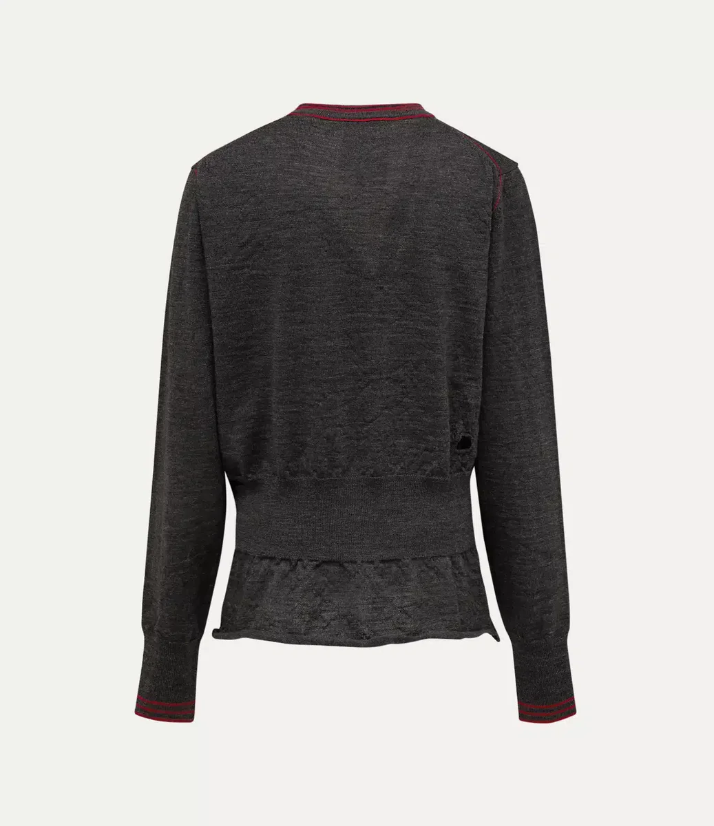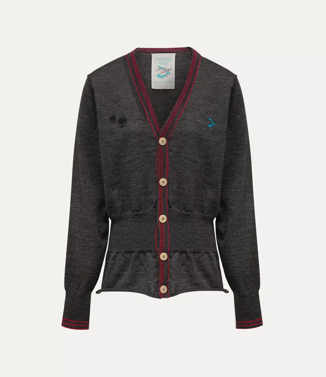 Our Worlds End Chaos cardigan features a button-front design with a V-neck silhouette, complemented by the ‘Arm and Cutlass’ detail on the left chest. The piece is finished with a rolled hemline and two front slashes, echoing Vivienne’s iconic ‘CHAOS’ collection and embodying her rebellious spirit and commitment to challenging political conventions.