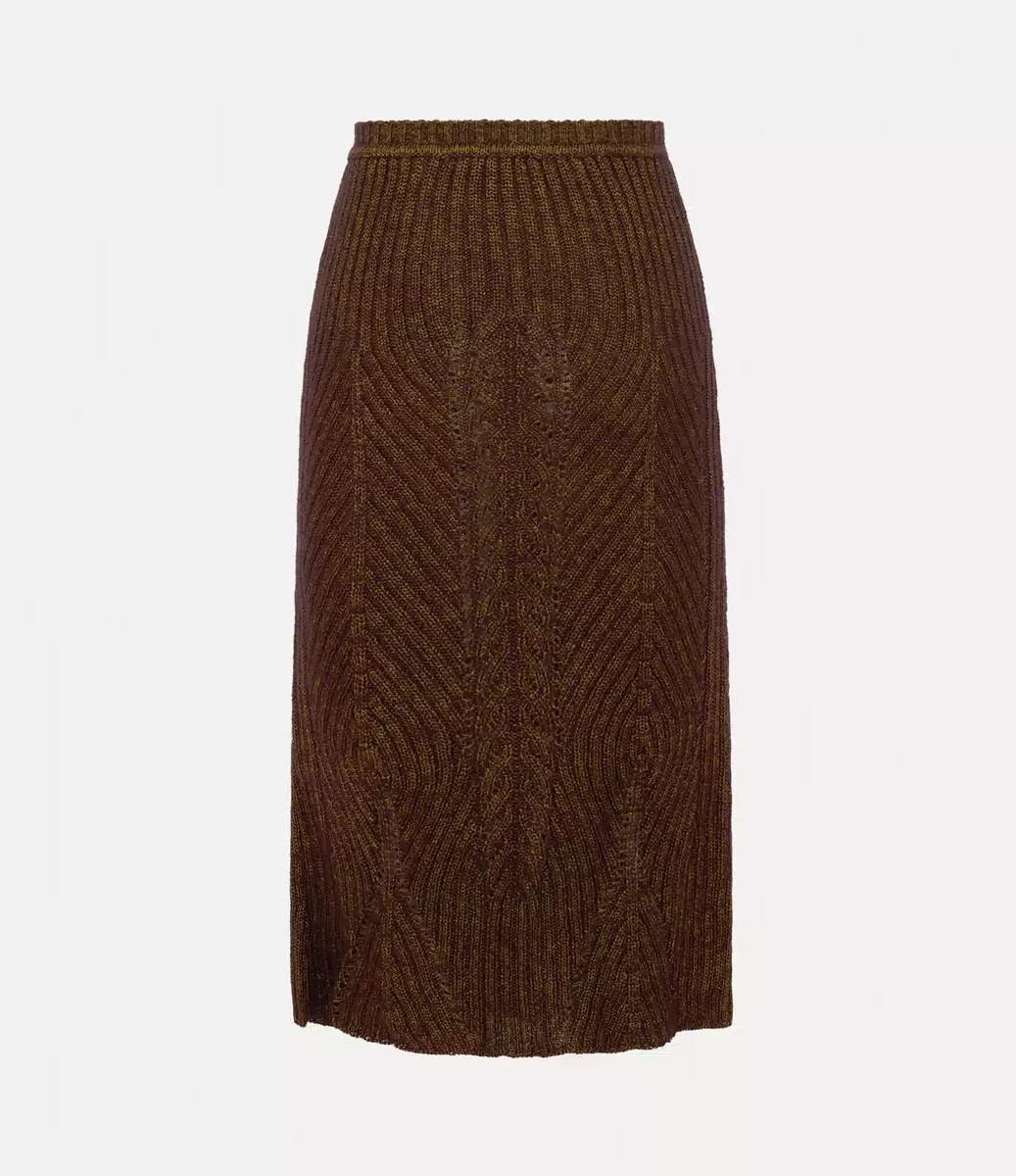 The mid-length Mary skirt is crafted from a silk-mohair blend and features a unique mix of herringbone and rib-knit stitches. The design offers a ribbed waistband and a subtle A-line silhouette, shaped by the knit structure. The multi-colored embroidered orb on the hemline reflects the house’s ethos of taking the past into the future.
