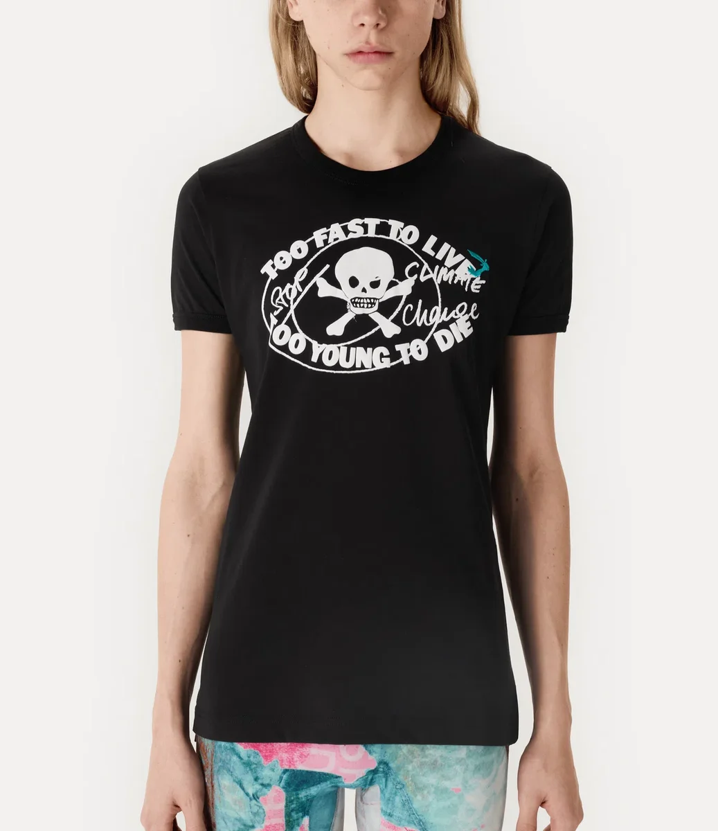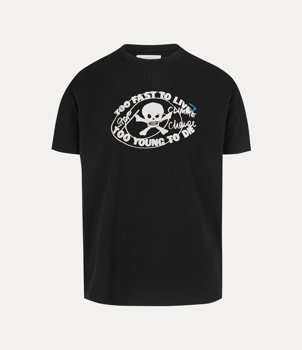 Our Worlds End Classic t-shirt is crafted from lightweight cotton, shaped with a crew neckline, short sleeves, and a straight hem. The design is complete with the “Too Fast to Live, Too Young to Die” slogan, taken from the signage of our iconic boutique, now known as Worlds’ End.