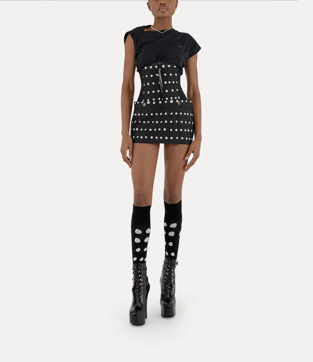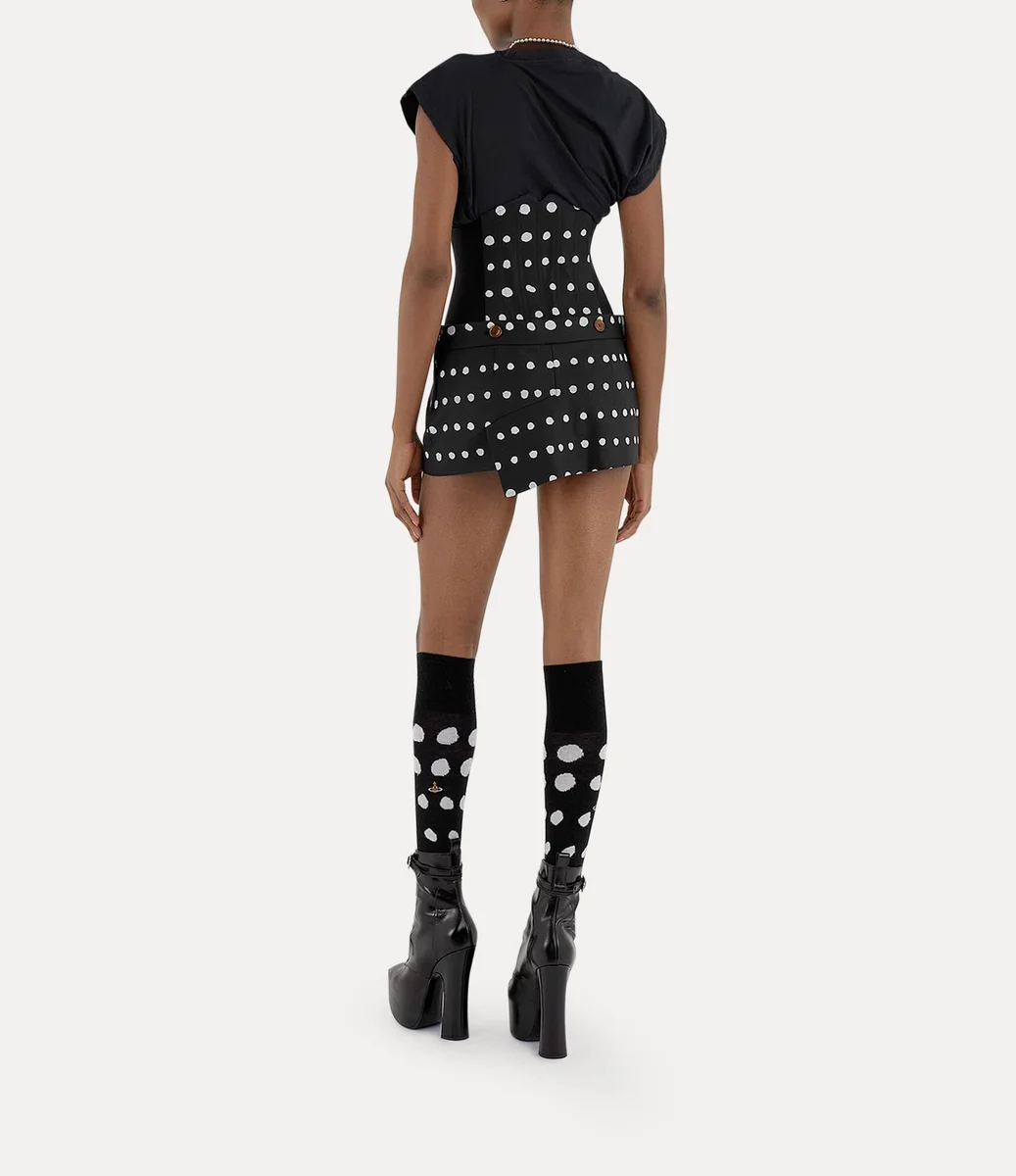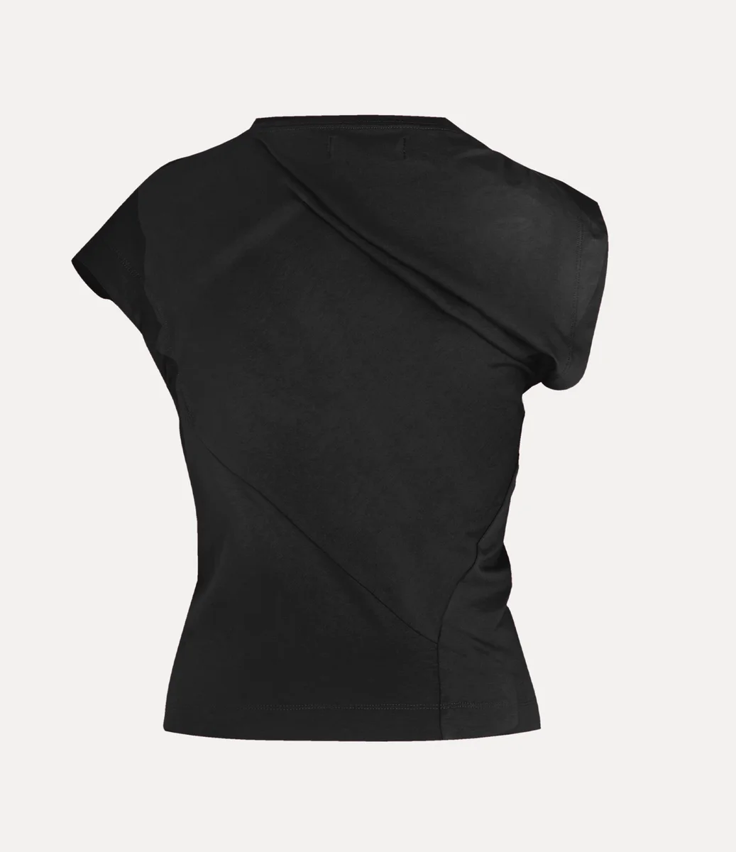 The house’s signature Hebo top has been updated, featuring a soft cotton finish this season and an orb embroidery on the left-hand side of the chest – synonymous with Vivienne’s vision of launching tradition into the future. The silhouette incorporates Vivienne’s signature slash-inspired neckline, drape details and twisted fabric at the back of the design.