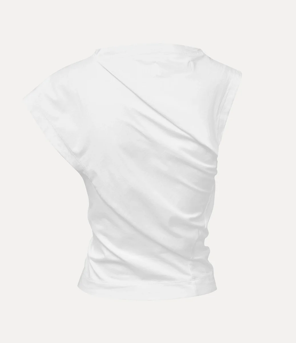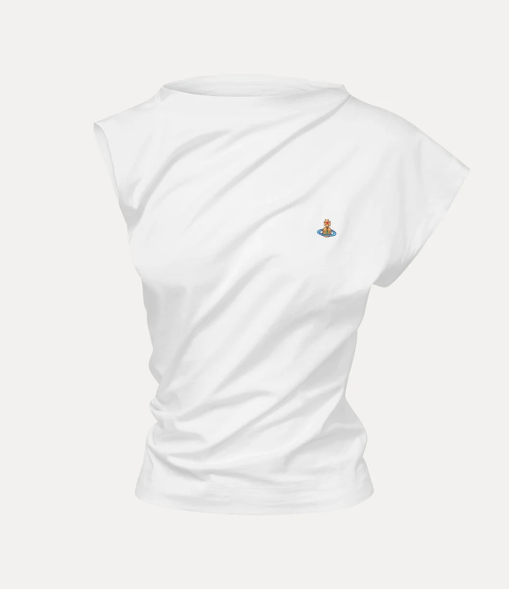 Vivienne Westwood Hebo top with a soft cotton finish and a multicoloured orb embroidery, complete with a slash neckline, drapery and a twist detail at the back.