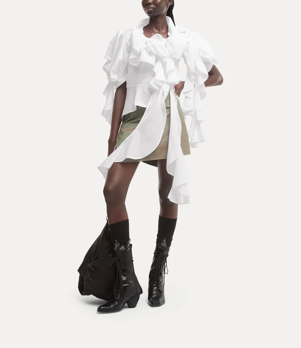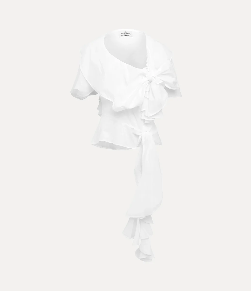 Our Lola Ruffle top drapes across the body with deliberate asymmetry to create a voluminous silhouette, finished with the house’s signature bow motifs, cascading into sweeping ruffle details. Cinching at the waist, the piece is framed by a romantic neckline and softly puffed sleeves.