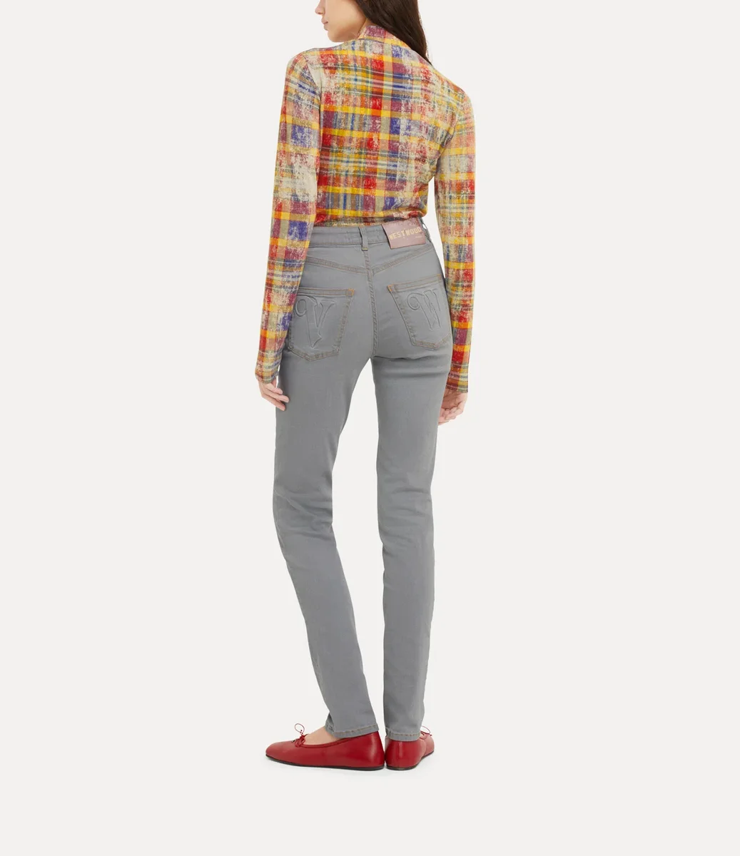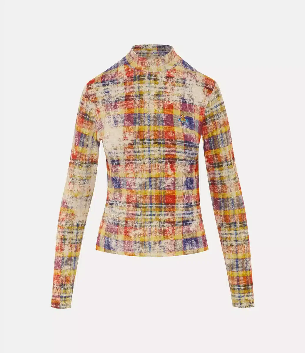 Our LS Turtleneck top is printed in a distressed tartan motif, influenced by traditional Scottish Highland regalia, finished with ‘Westwood’ in large yellow block letters, drawing inspiration from the iconic Hollywood sign. The piece features an embroidered orb, which symbolises tradition, encircled by the celestial rings of Saturn, symbolising the future.