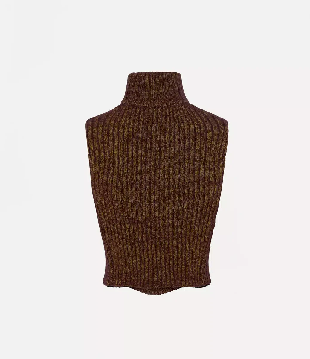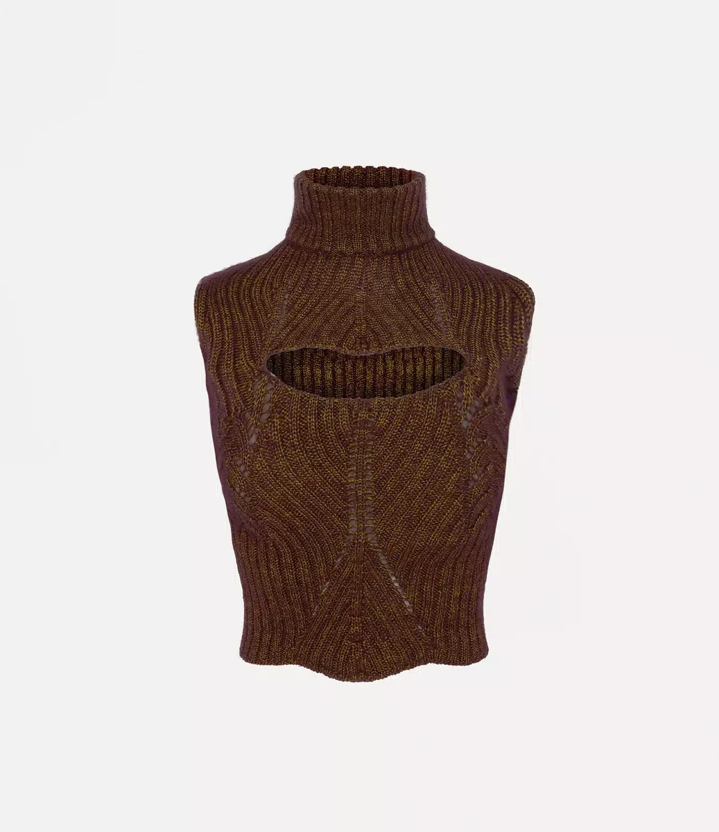 Vivienne Westwood Mary Corset top, crafted from a silk-mohair blend, features a slit above the chest, and ribbed detailing along the high neckline and design.