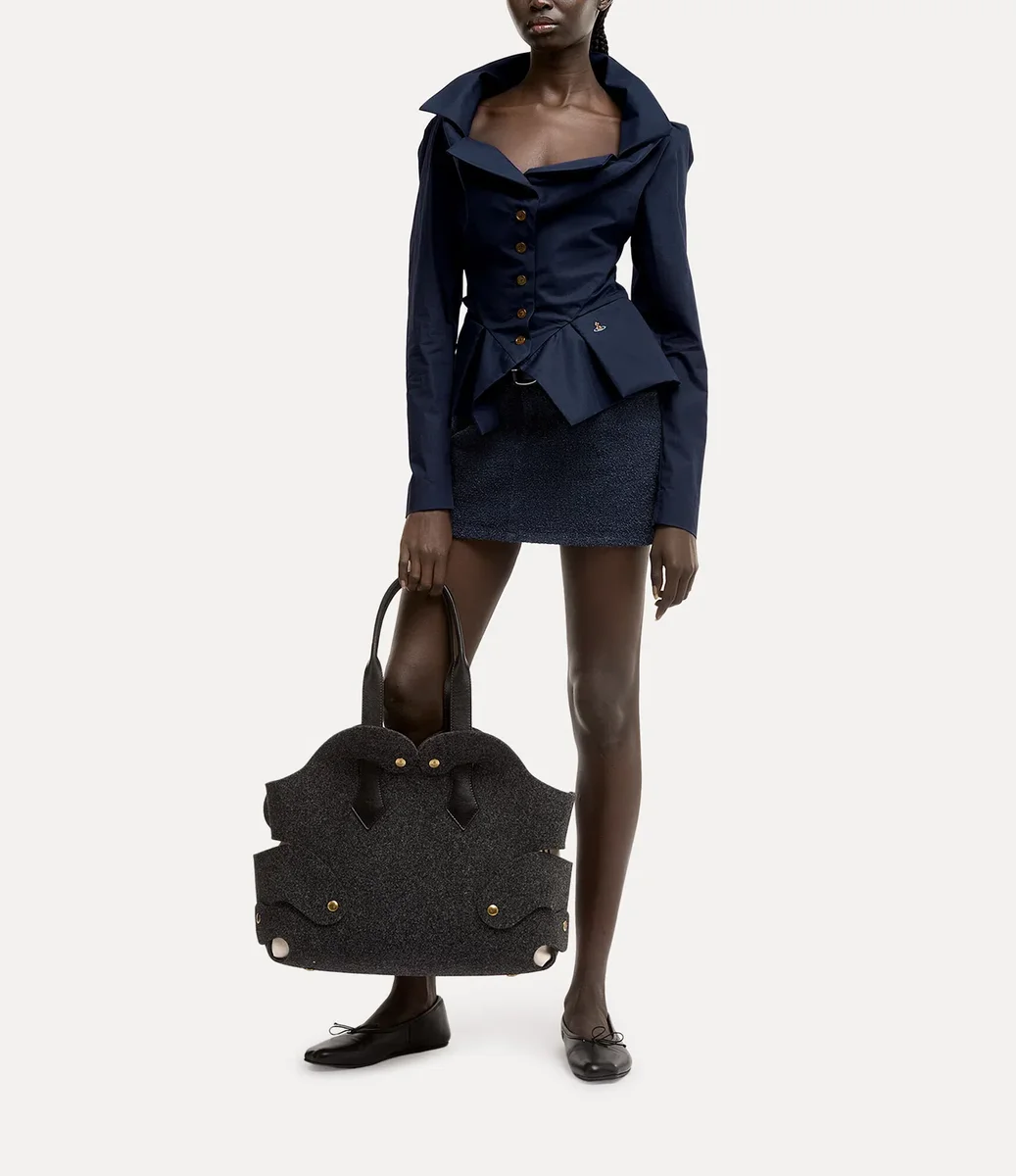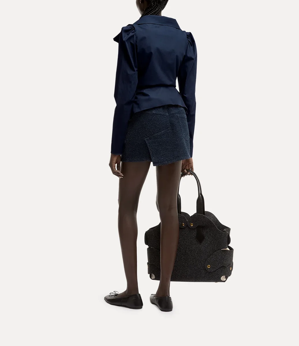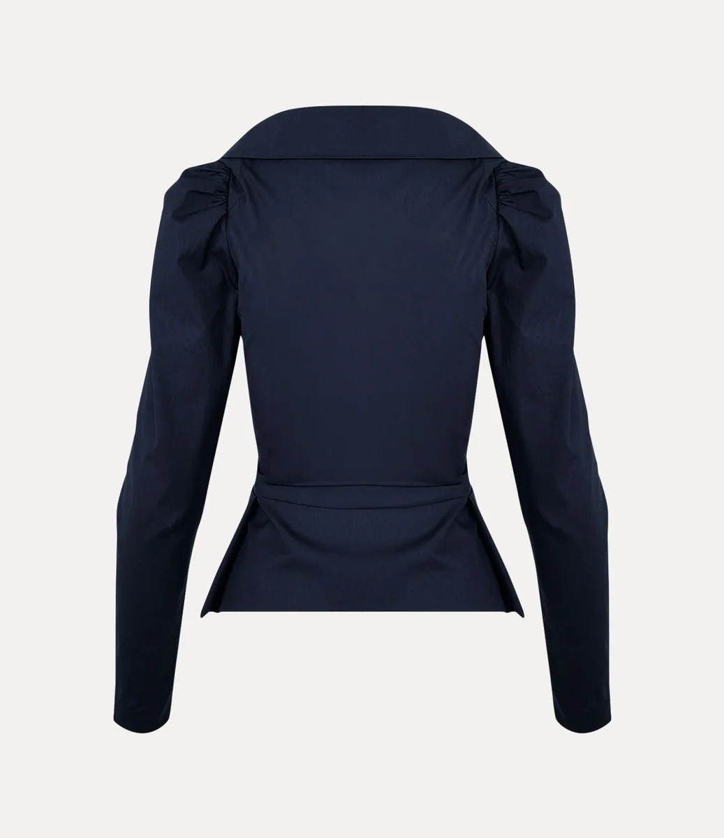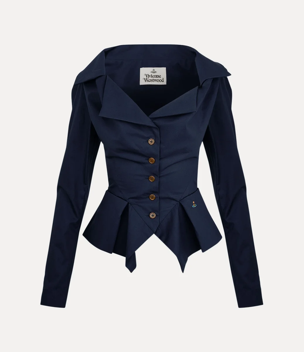 Our Monday shirt offers origami-like folds of fabric around the neckline, adorned with letter-engraved button fastenings and our signature multi-coloured orb embroidery at the hip. The piece offers a fitted bodice with a flared, pleated fabric extension at the waist, finished with elegantly puffed shoulders.