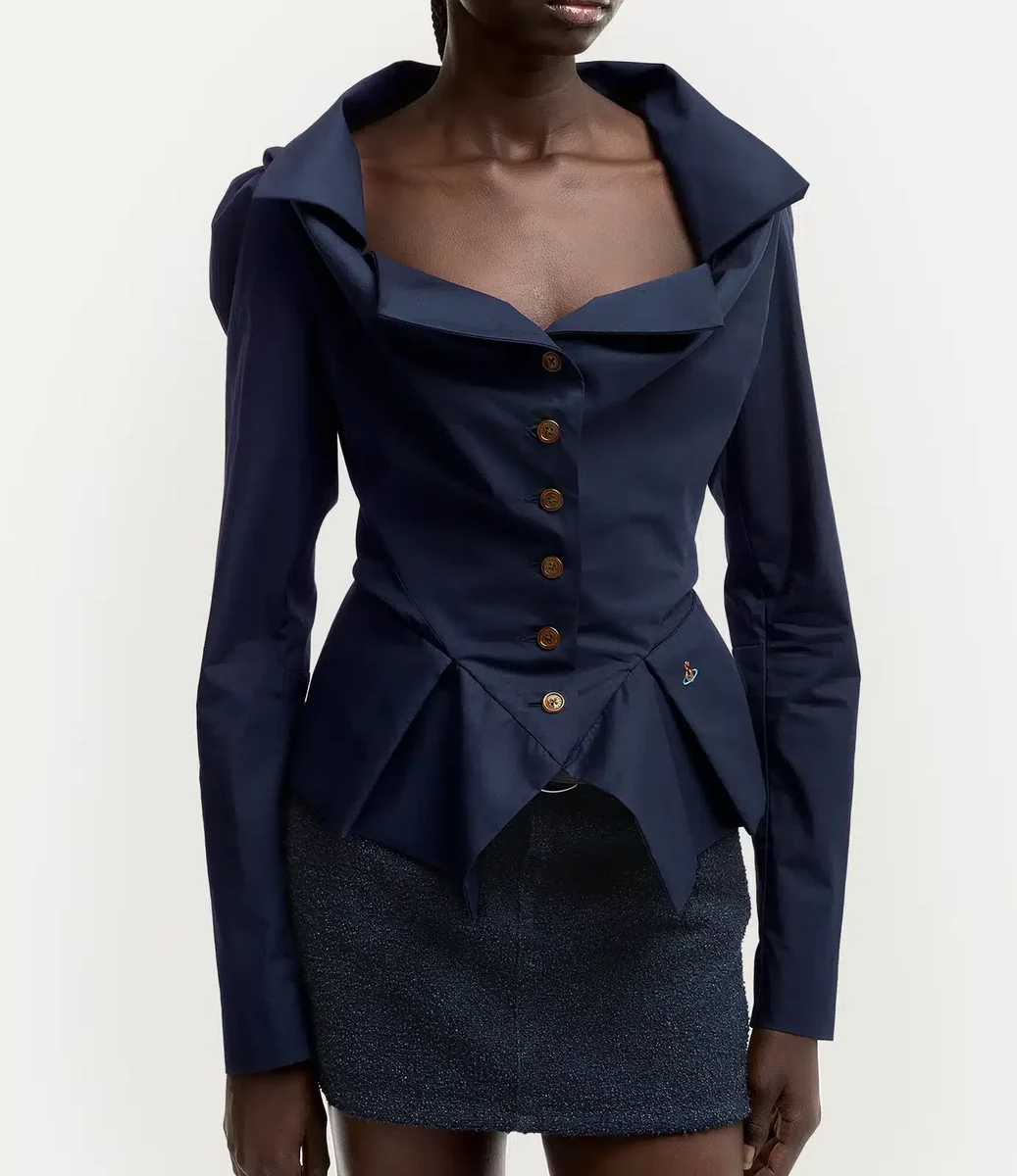 Vivienne Westwood Monday shirt in organic cotton offers origami-like folds of fabric around the neckline, adorned with a multi-coloured orb embroidery.