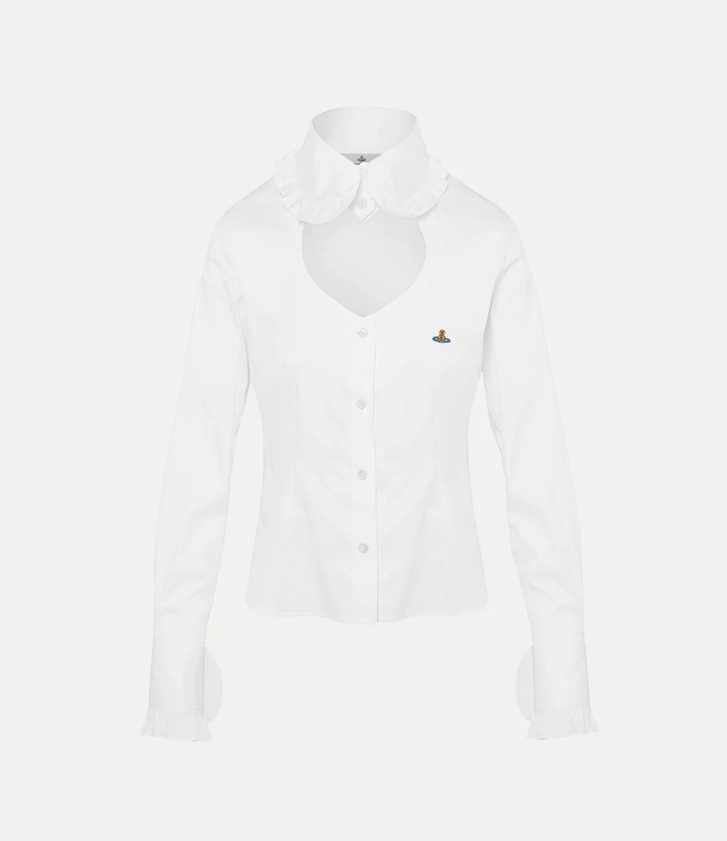 The Toulouse Frill shirt revives our archival cut-out heart tailoring at the neckline – synonymous with Vivienne’s affection for both humanity and the planet. The piece is finished with our signature orb embroidery at the chest, complete with a delicately rounded collar, framed with gathered frill detailing.