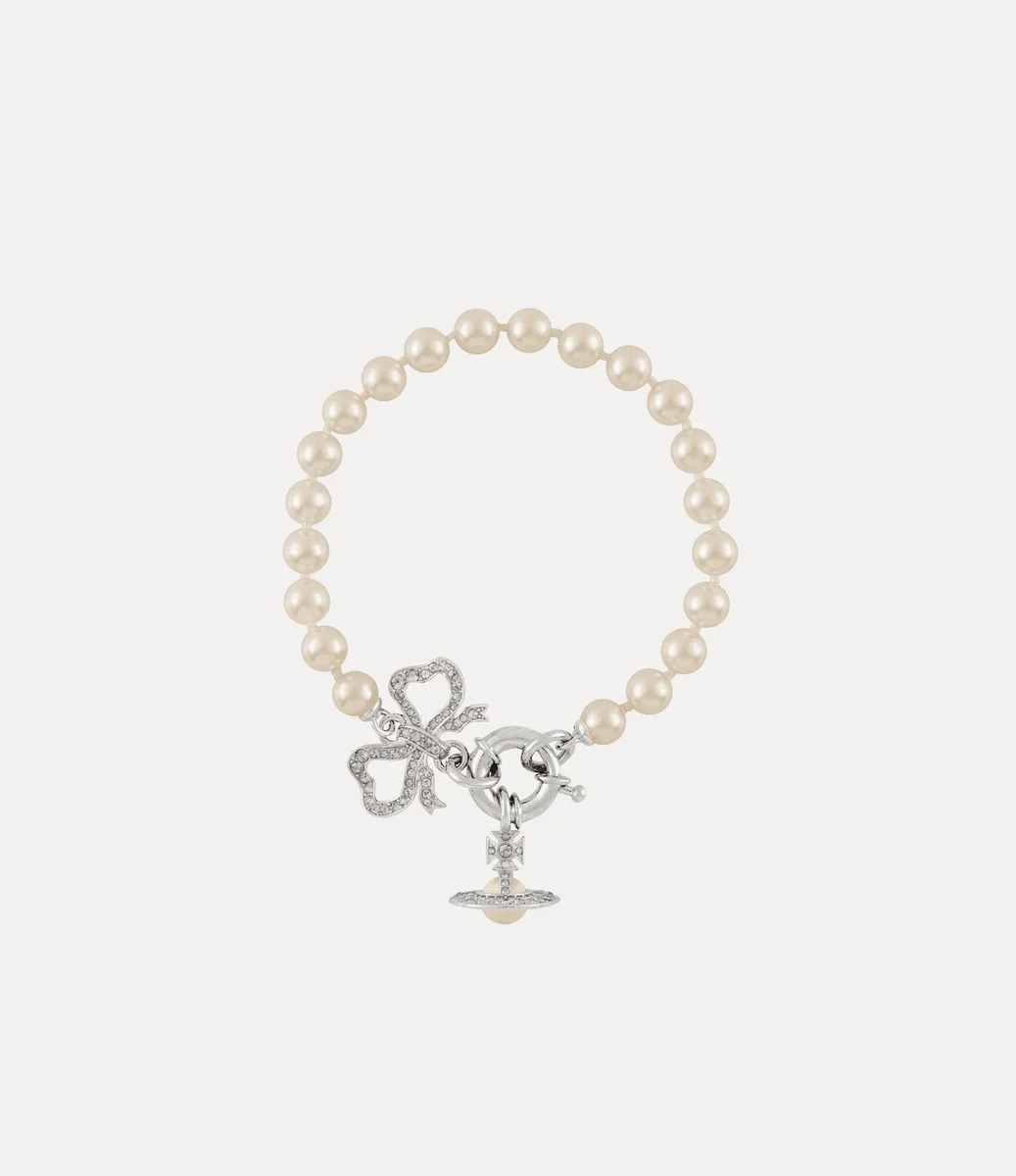 The Rigoberta Pearl bracelet revives the archival butterfly bow charm, signature iconography of the house, complete with opulent pearls and crystal-embellished details. At the centre of the design sits a dangling three-dimensional orb motif, finished with a polished spring-clip fastening.