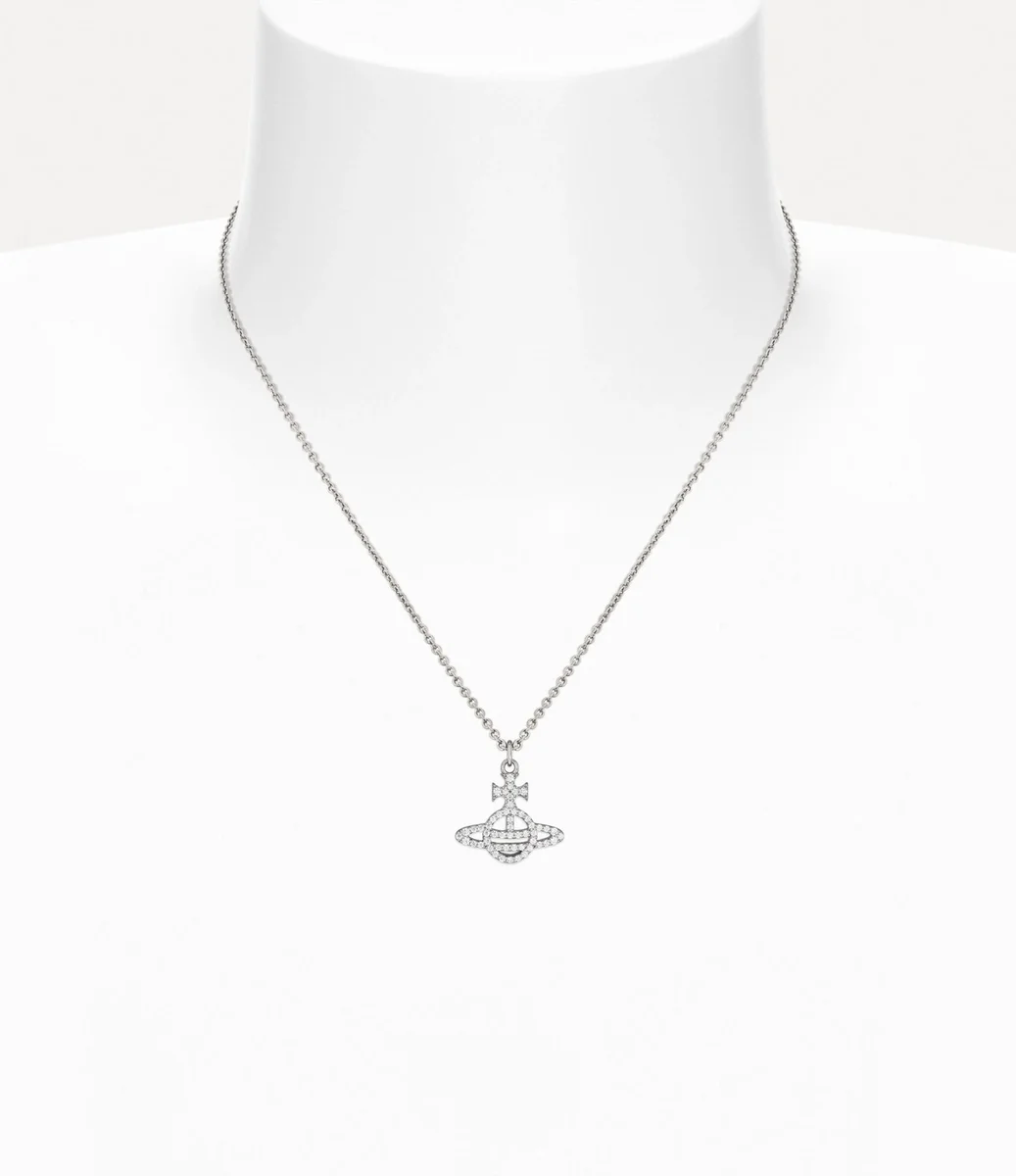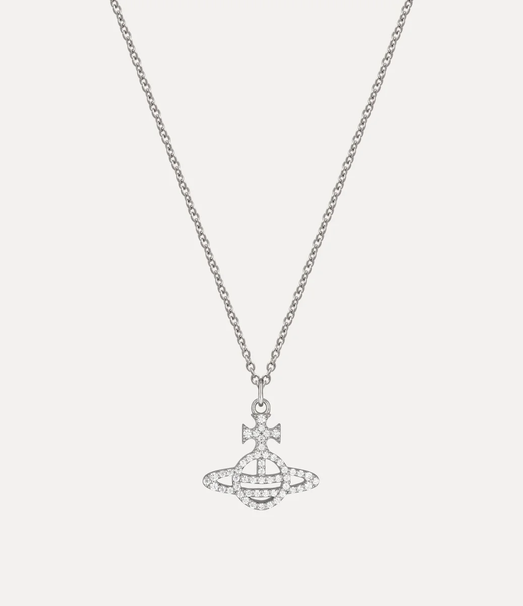 Our Calliope Pendant necklace is a signature style of the house, with a distinct metal orb in the centre, inspired by our house’s orb-shaped motif. Encrusted with glistening white crystals, the style recalls Vivienne’s vision of taking tradition into the future.