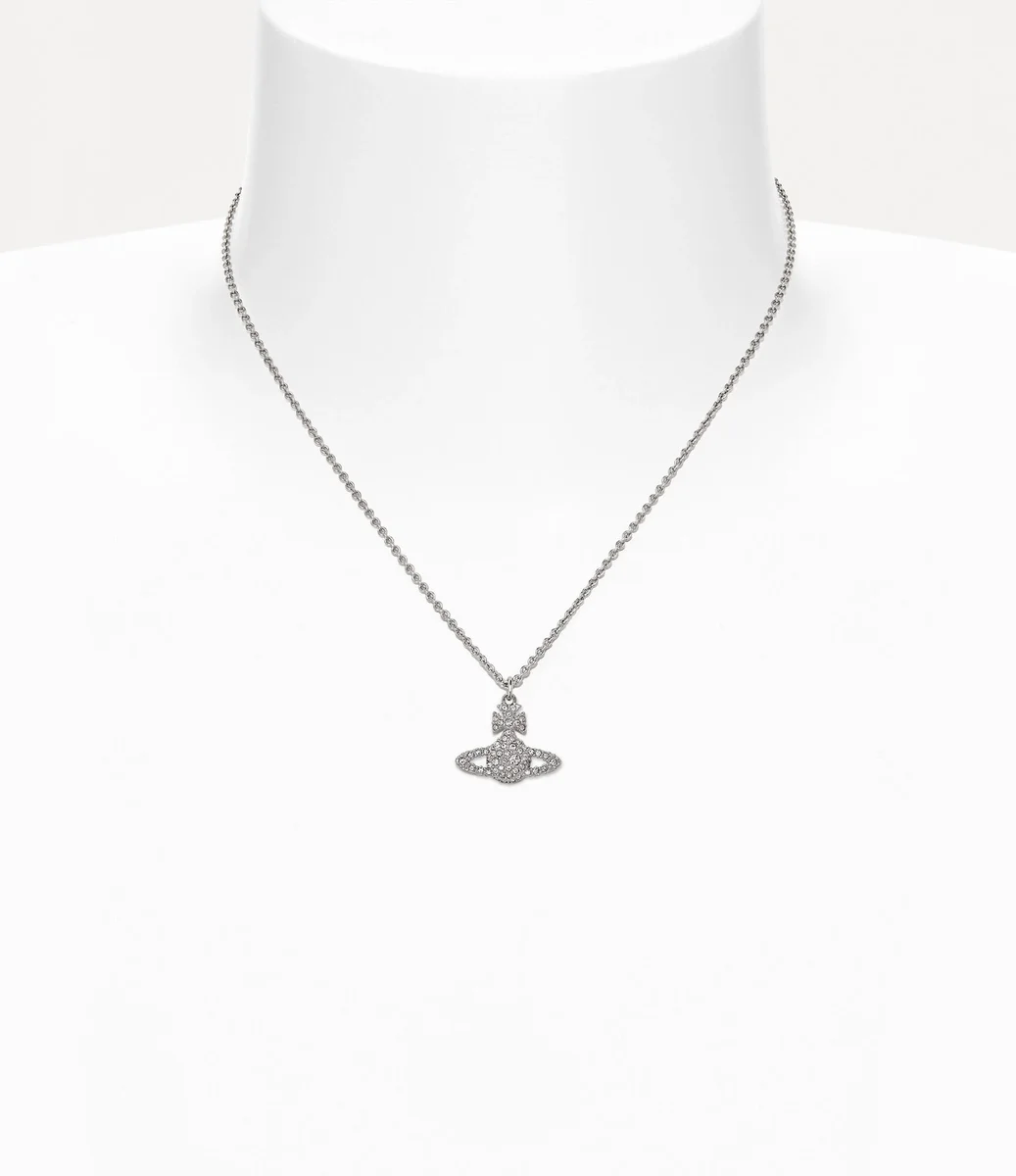The Grace Bas Relief Pendant necklace pays homeage to Vivienne’s vision of launching tradition into the future, featuring a two-dimensional orb motif at the centre of the design. The piece offers a surface of white crystals decorating the silhouette, complete with polished, silver-tone plating.