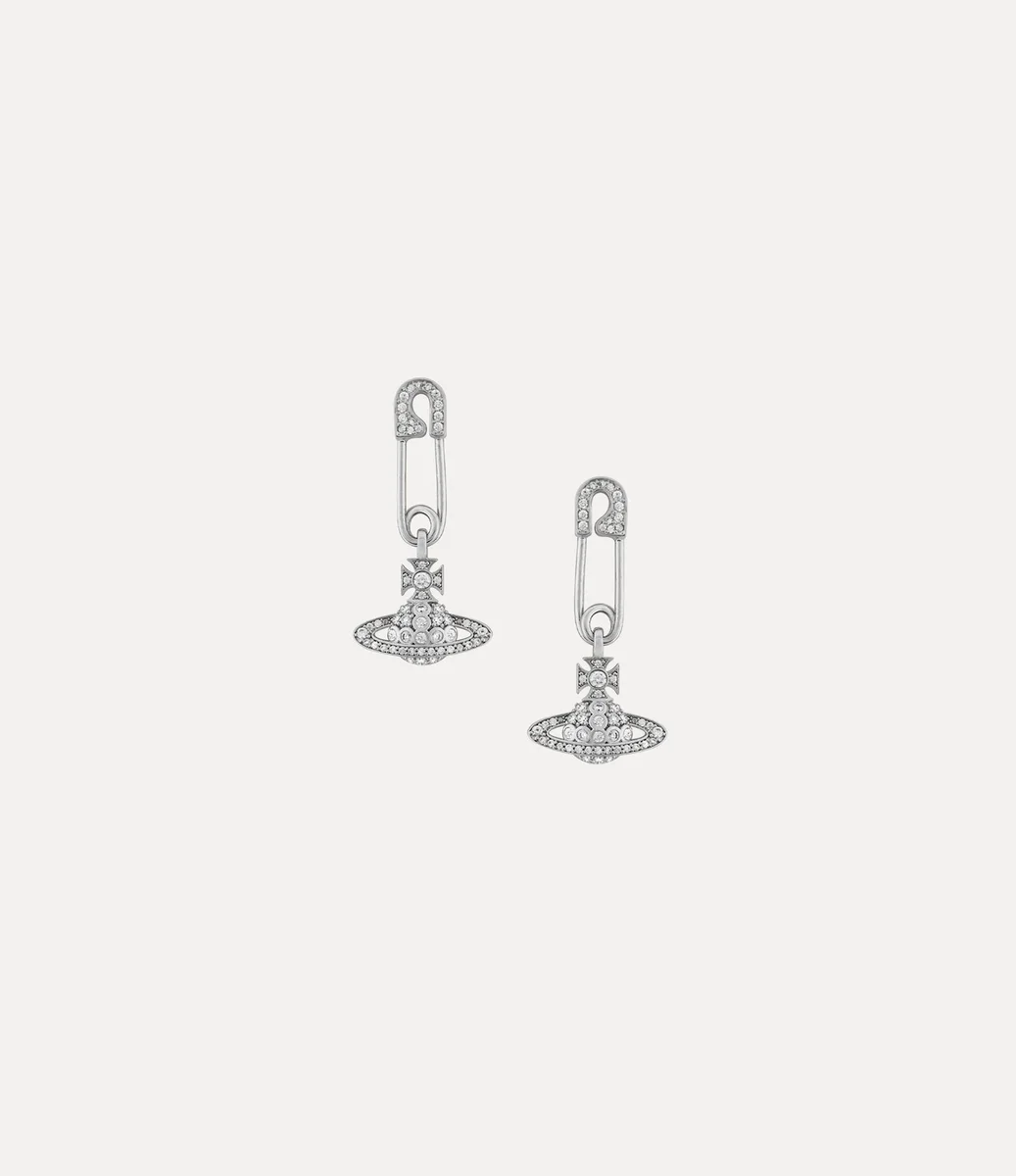 The Lucrece earrings feature a two-dimensional safety pin design, recalling Vivienne’s rebellious punk aesthetic. The piece offers a drop silhouette with a dangling orb detail, complete with shimmering crystal adornments and polished, silver-tone plating.