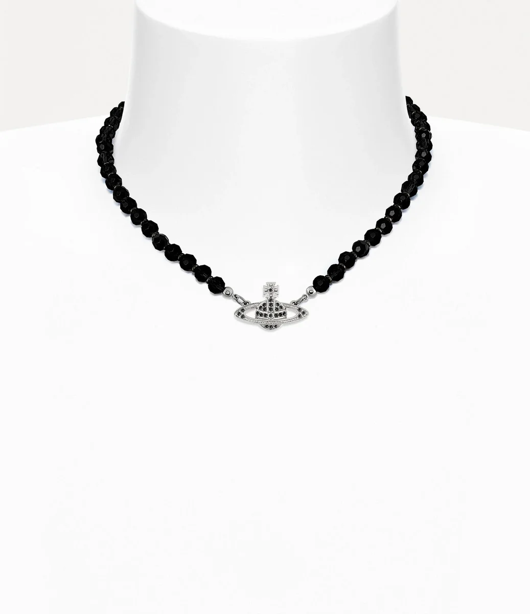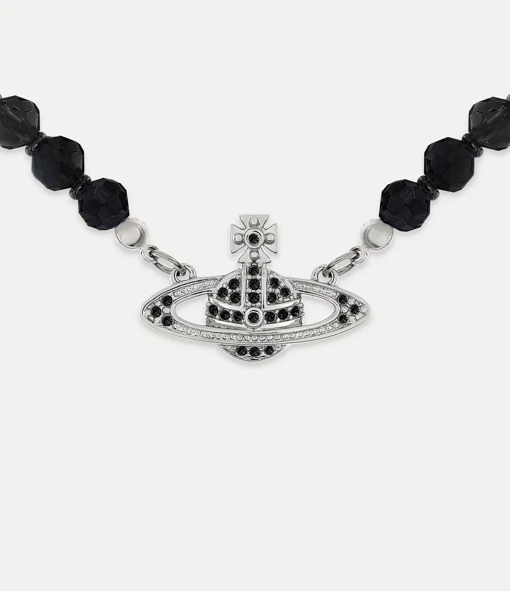 Our Messaline choker is reimagined with hand-knotted black agate crystals, each detailed with an intricately carved finish. The bold piece features our signature orb pendant, adorned with jet black crystal embellishments and silver-tone plating, embodying Vivienne’s vision of propelling tradition into the future.