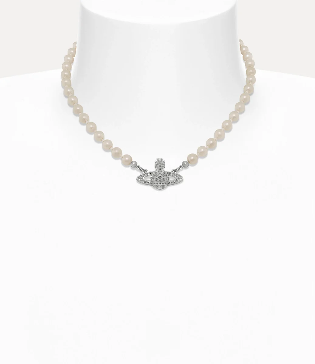 In the late 1980s, Vivienne Westwood introduced her iconic pearl concept at the Harris Tweed Fall 1987 fashion show, featuring a single-strand choker. Our Mini Bas Relief Pearl choker takes inspiration from this original design, reimagining it with the classic orb motif at the centre, enhanced by glistening crystals – recalling the house’s ethos of linking the past with the future.