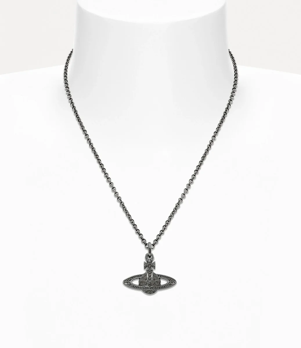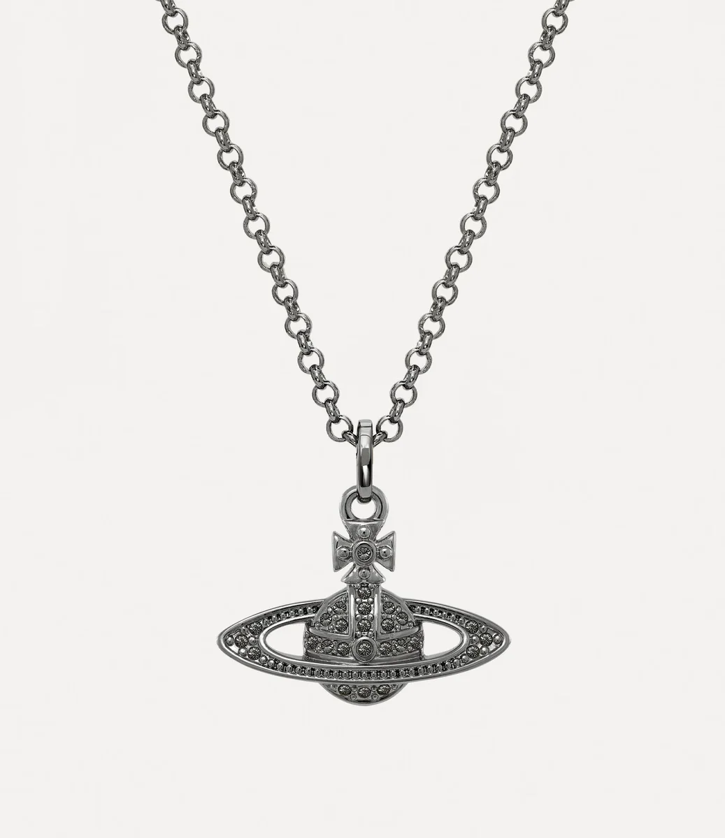 The orb is an essential element of the house’s iconography, evoking Vivienne’s vision of launching tradition into the future. Our Mini Bas Relief Pendant necklace features a crystal-encrusted orb at the centre of the design, complete with an engraved tag at the classic lobster clasp.