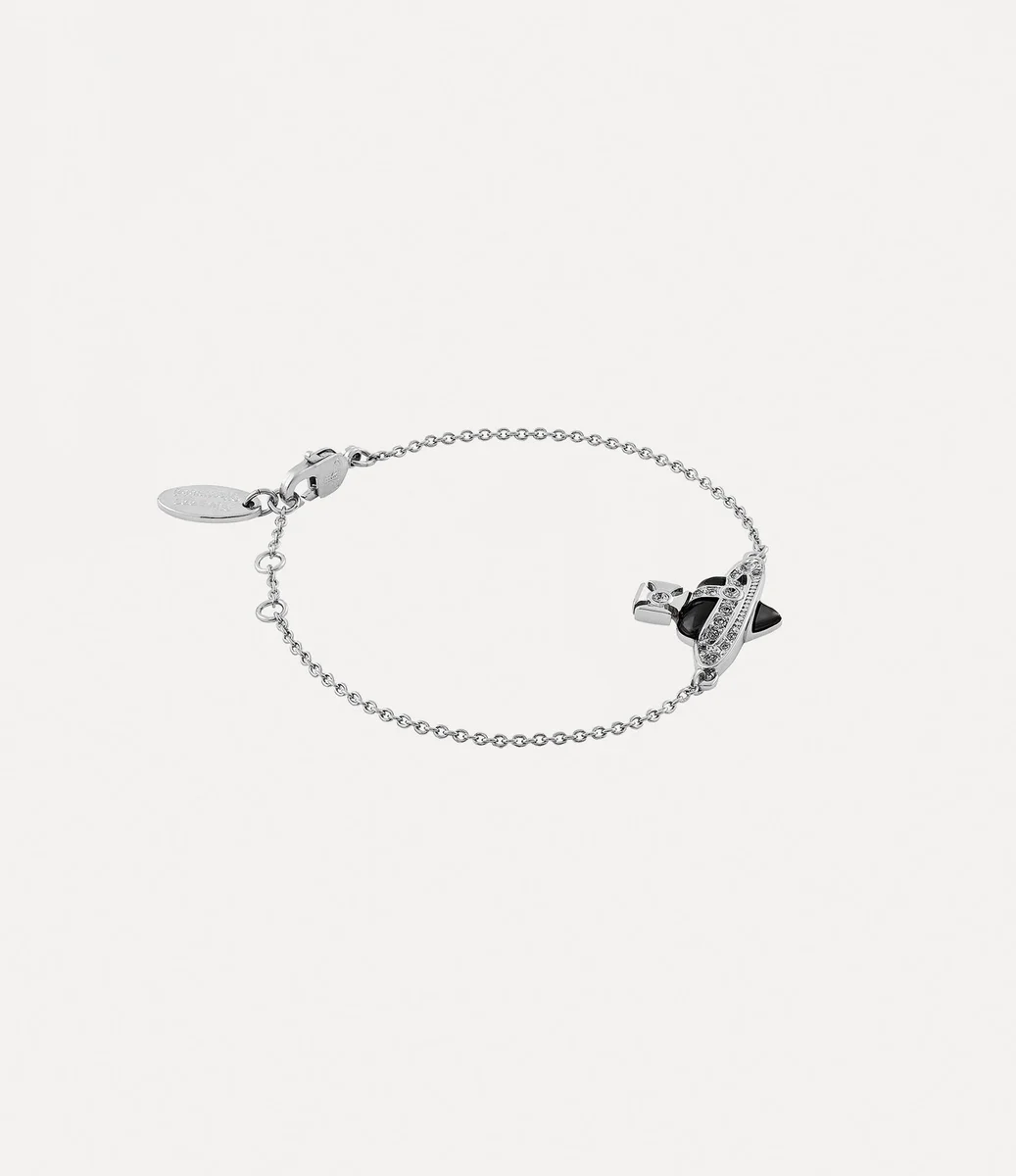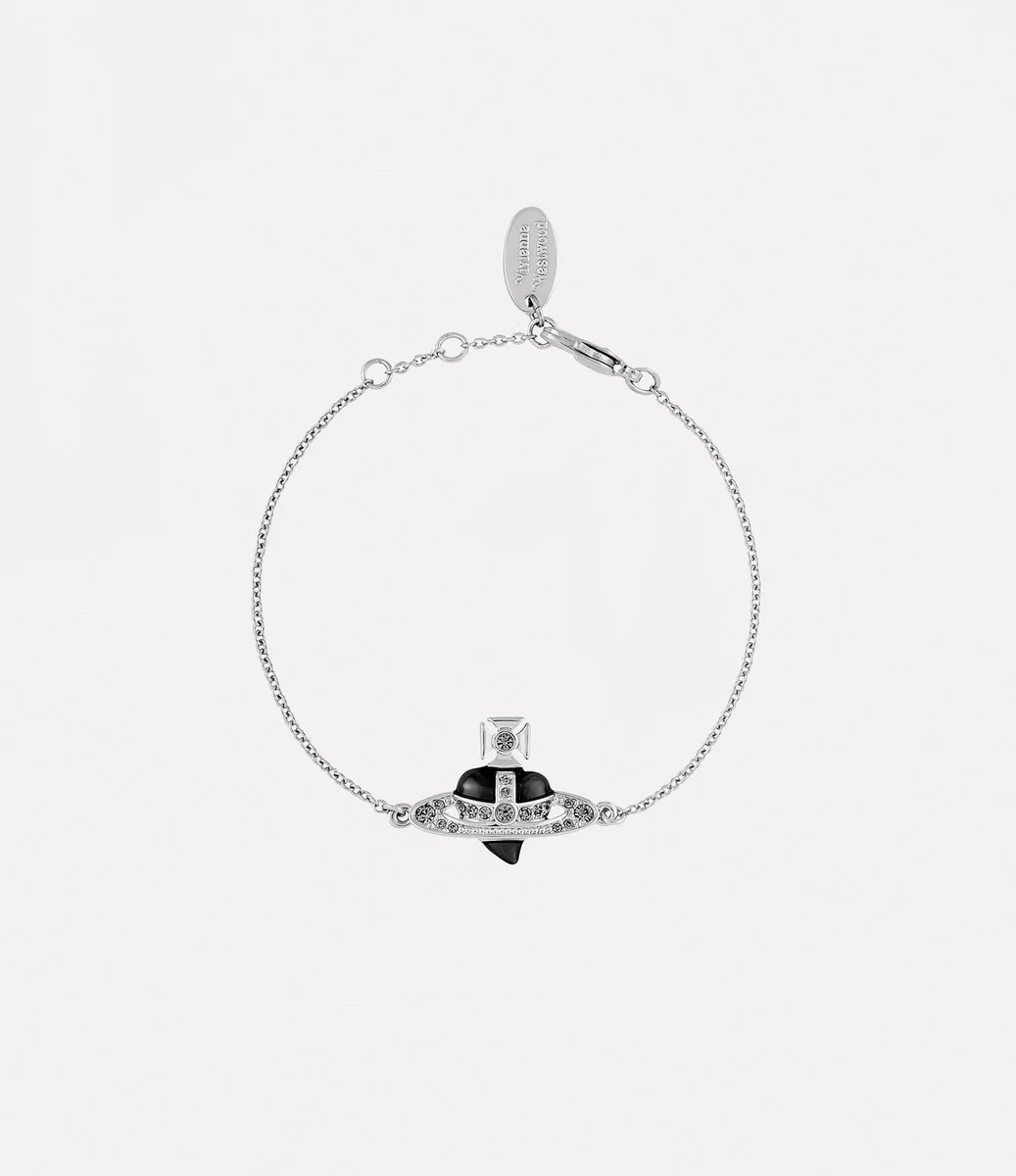 Our New Diamante Heart bracelet features an asymmetric heart motif, recalling Vivienne’s affection for humanity and the planet. Cast in silver-tone plating, the design features a hand-painted black enamel heart, intricately detailed with sparkling crystal embellishments.
