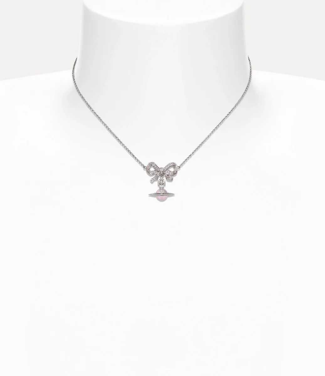 Our Octavie choker receives a bow-shaped design reminiscent of Georgian jewellery, adorned with pavé-set glistening crystals in a pink finish. This piece incorporates our signature three-dimensional dangle orb motif, featuring a finely crafted pink gemstone at its centre.