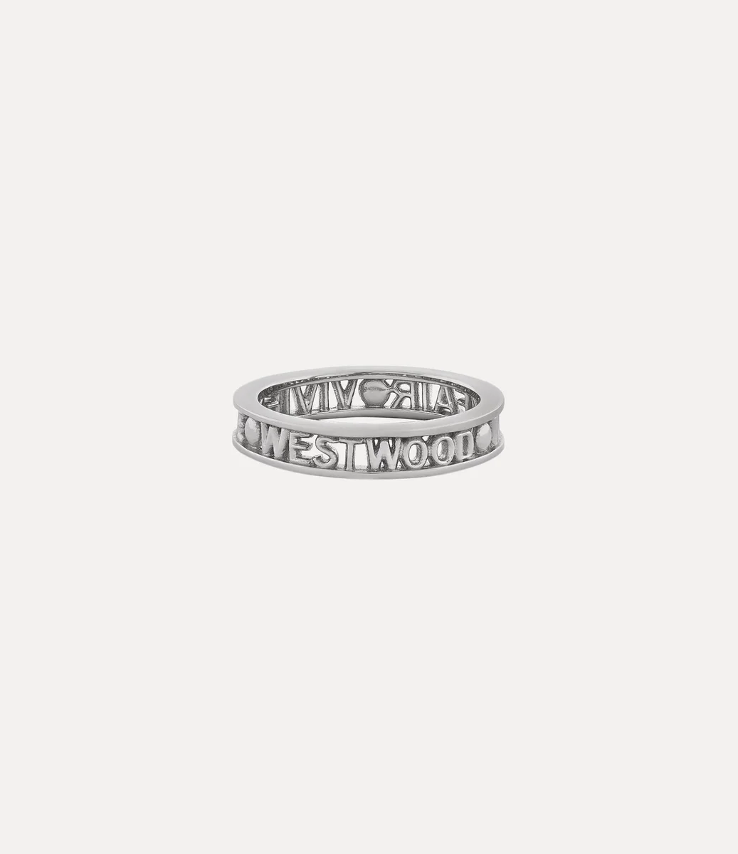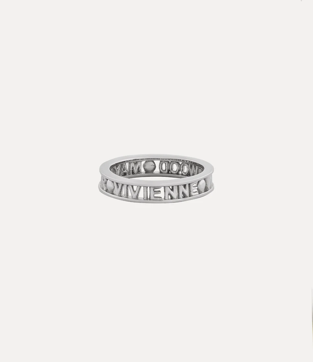 The Vivienne Westwood Westminster ring is named after the esteemed Westminster district in London, renowned for its rich history and cultural importance. The piece receives a silhouette crafted from recycled silver, adorned with a platinum-tone finish that elegantly encircles the slim lettering logo on the band.