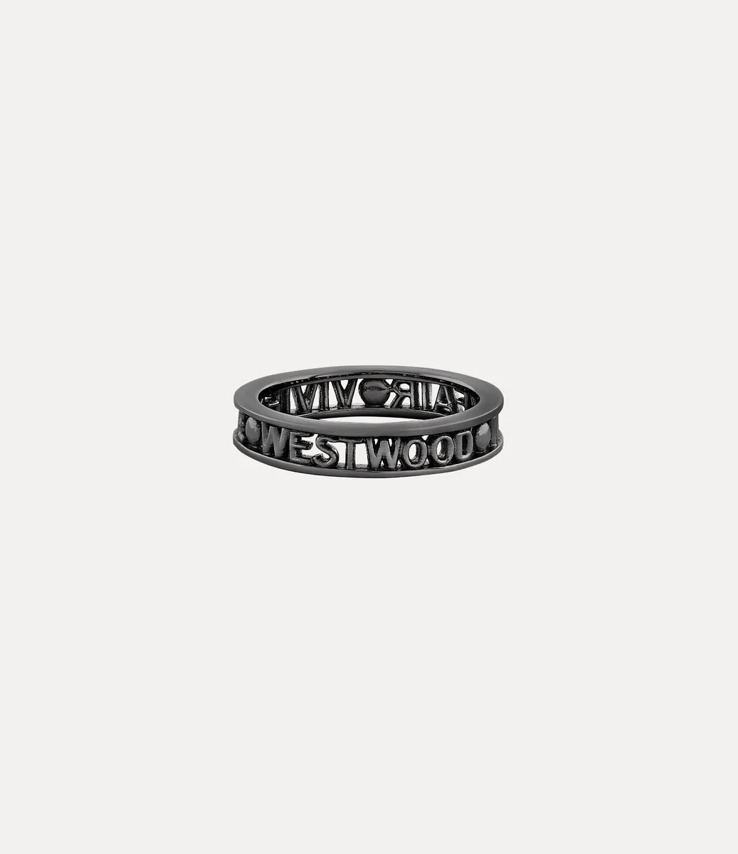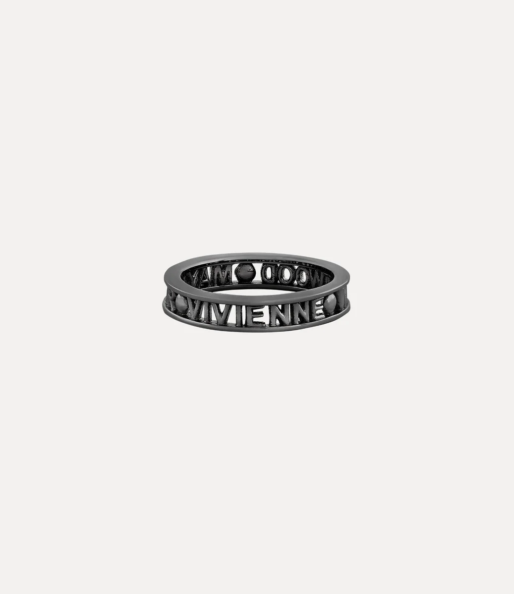 The Vivienne Westwood Westminster ring is named after the esteemed Westminster district in London, renowned for its rich history and cultural importance. The piece receives a silhouette crafted from recycled silver, adorned with a gunmetal-tone finish that elegantly encircles the slim lettering logo on the band.