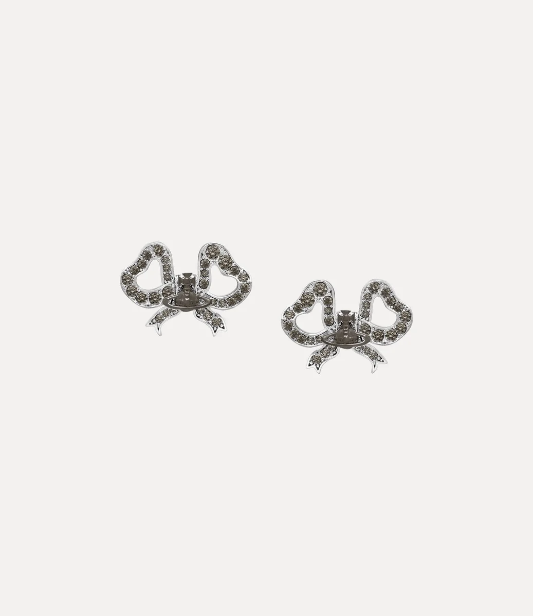 The Rigoberta earrings feature an intricate bow-shaped silhouette, adorned with a row of glistening black crystals. At the centre of the design sits a polished gunmetal-toned orb, which symbolises tradition, encircled by the celestial rings of Saturn, symbolising the future.