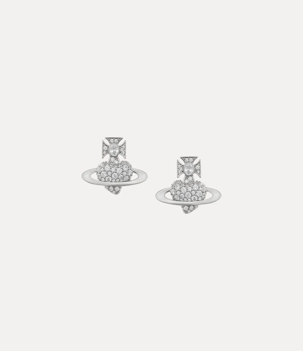 The Valentine’s Agnatha earrings feature an asymmetric heart silhouette, a symbol of Vivienne’s affection for humanity and the planet. The piece is decorated with shimmering crystal embellishments in white tones, adorned with polished silver-toned plating, finished with hand-painted white enamel details within Saturn’s celestial ring.