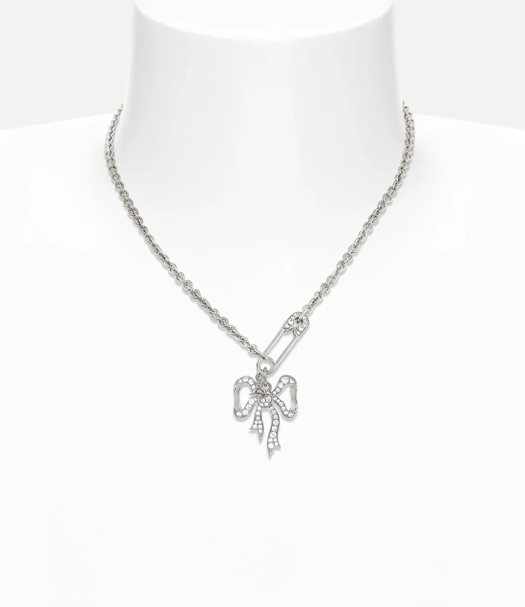 The Lilith Pendant necklace features the house’s signature iconography, pairing a Georgian-inspired bow with a safety pin silhouette that nods to Vivienne’s punk aesthetic. Adorned with white crystals, the silver-tone design is finished with a secure lobster clasp and an orb-branded tag.